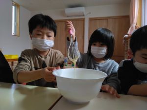 先生から“今日は2階でホットケーキを作りますよ”