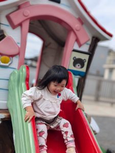 滑り台のお家の中に、ママも一緒に入りましたよ。