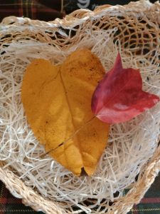 好きな色のはっぱを、あたまにチョンと乗せて帽子にしましたよ。