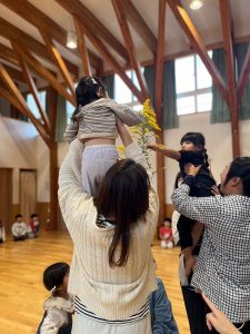 アルバン広場のお友だちはお家の方にだっこしてもらって、黄色いお花にこんにちは😀