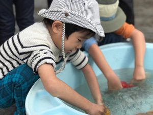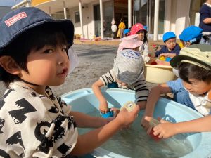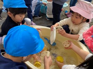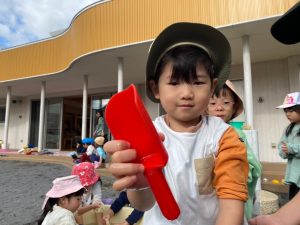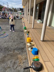 園庭では砂遊びのシャベルやカップなどの