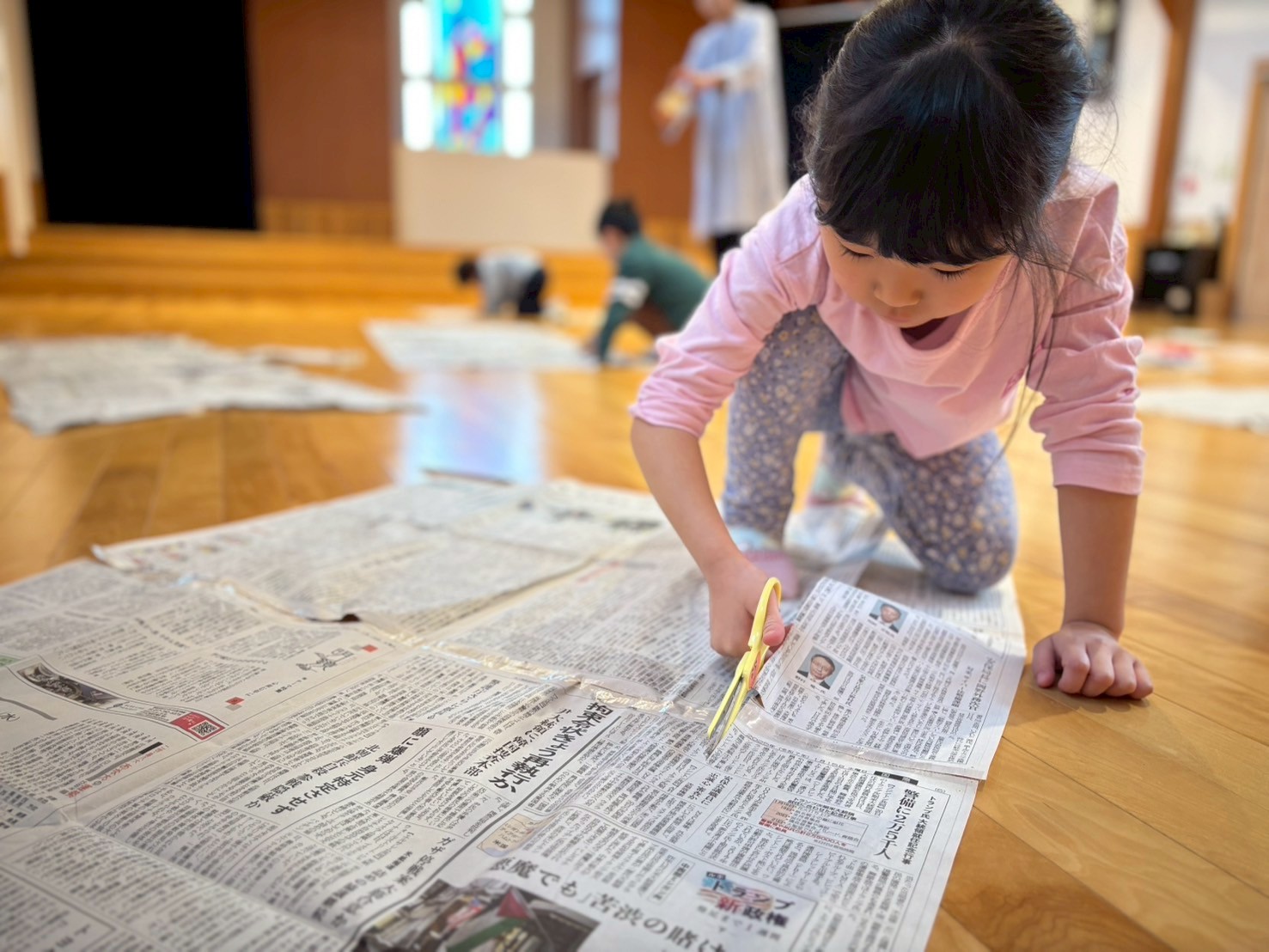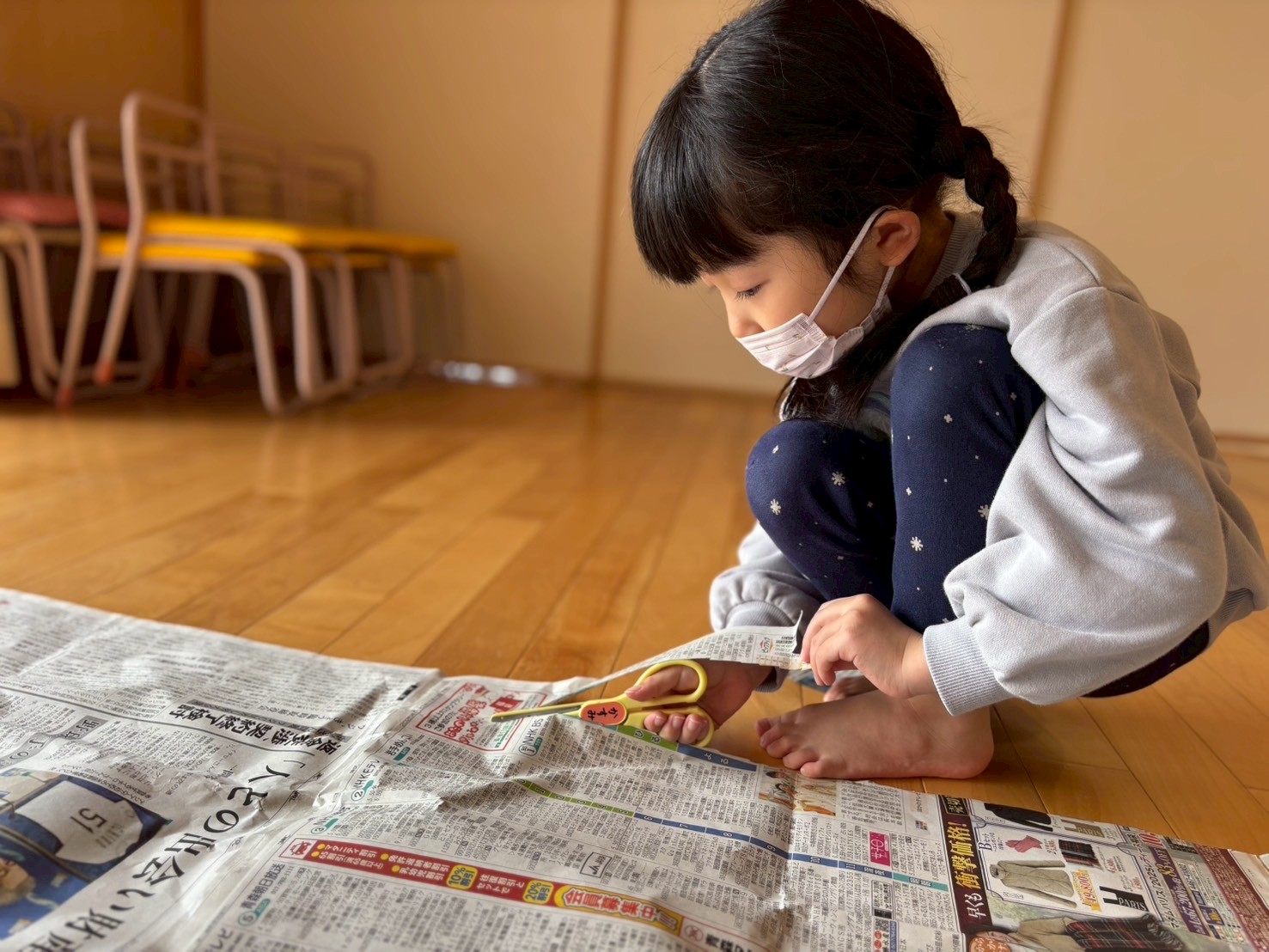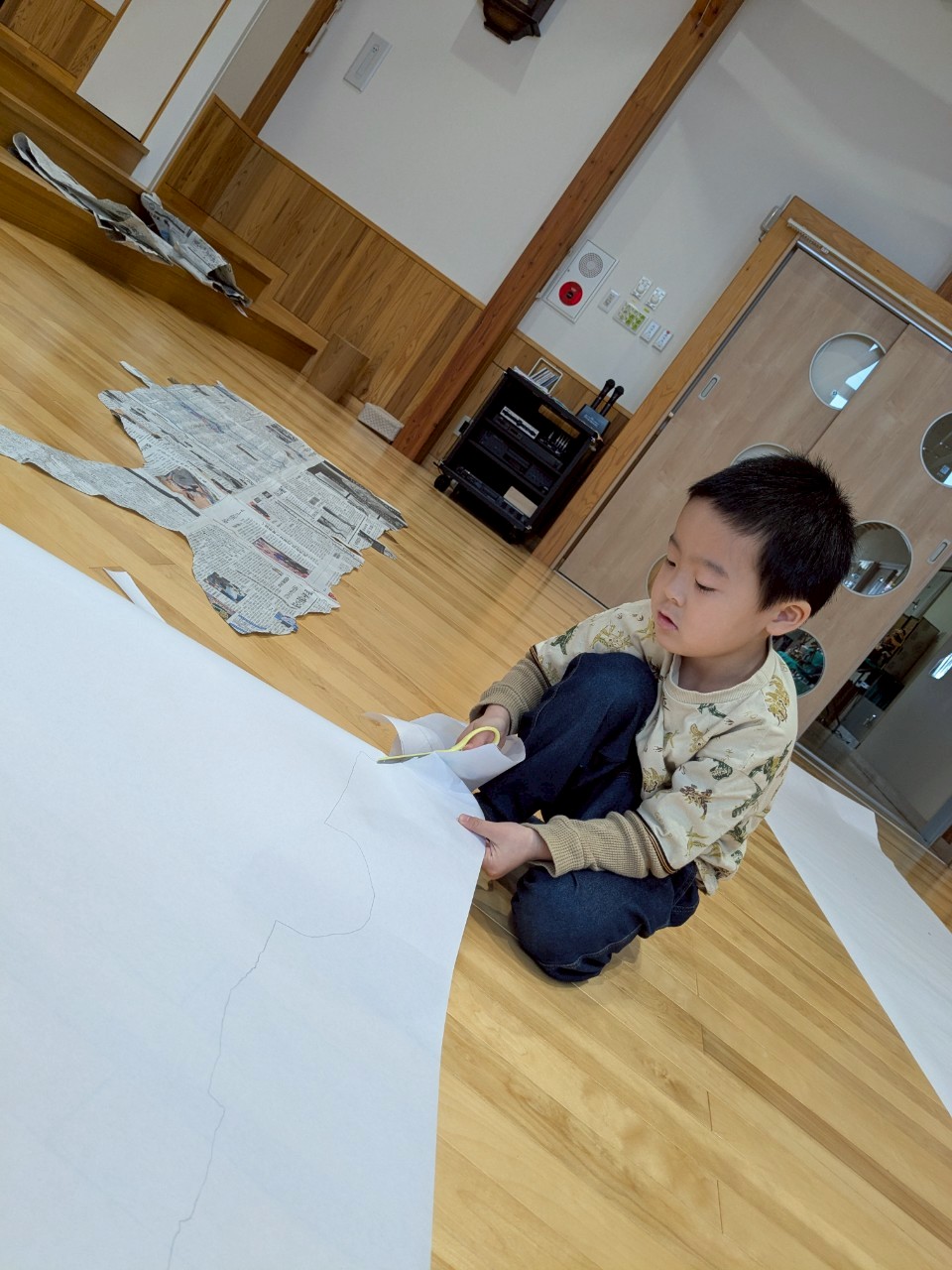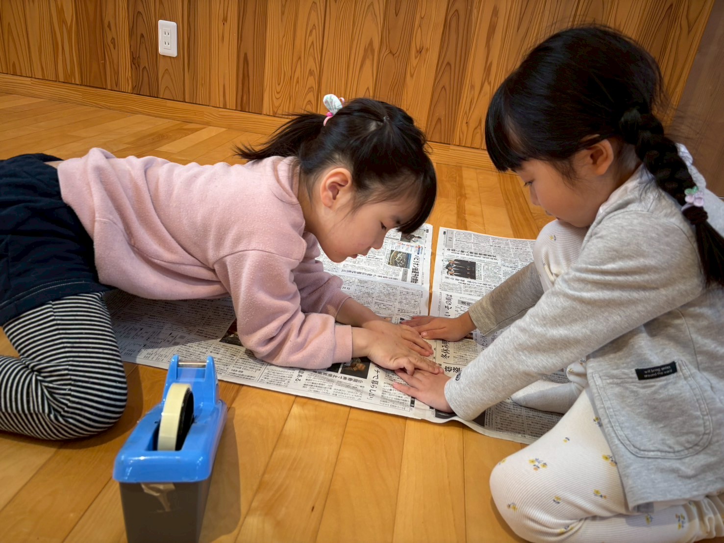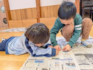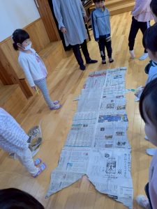新聞紙で型をとりますよ」