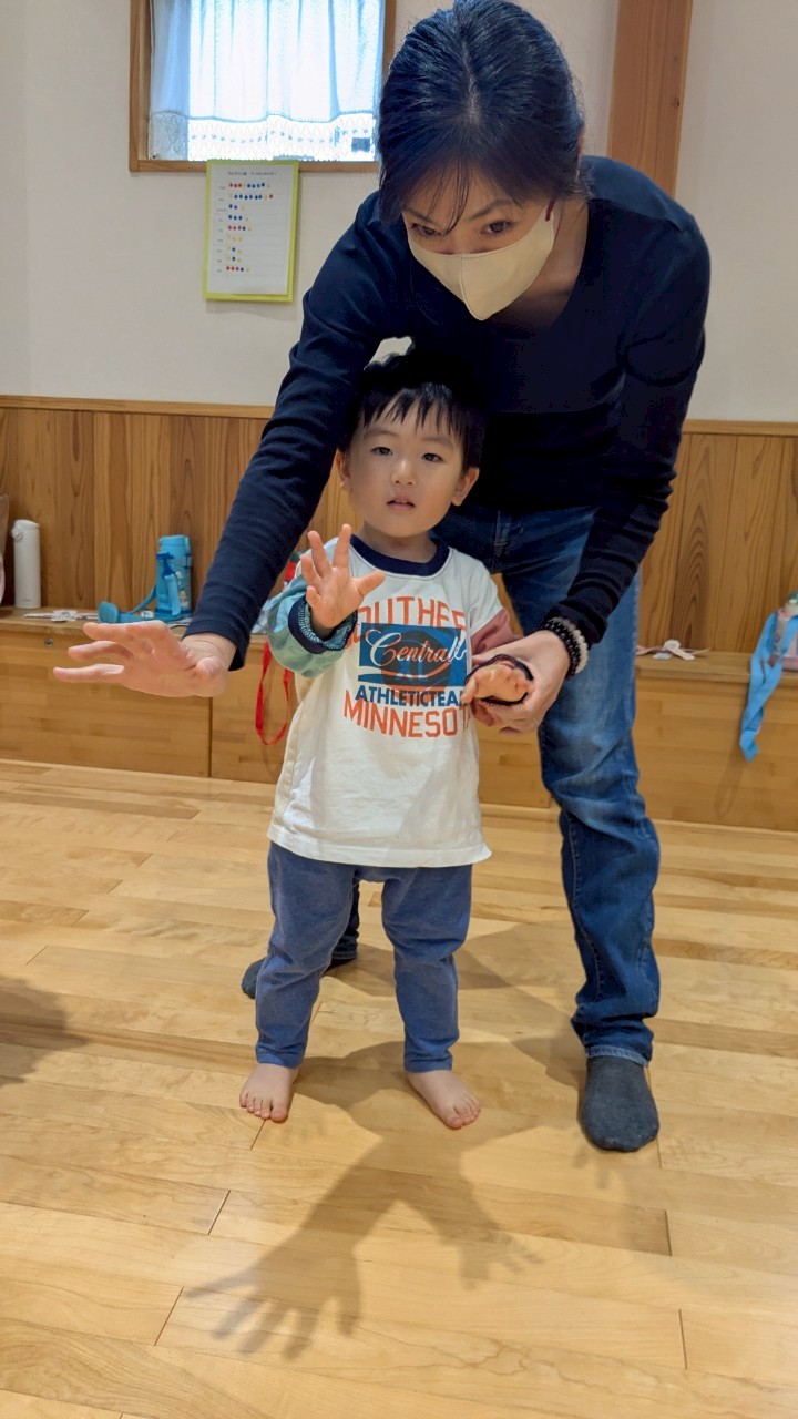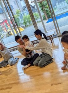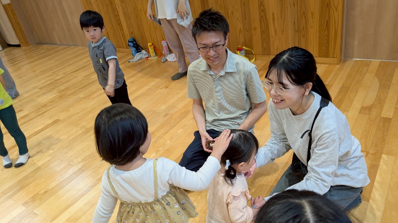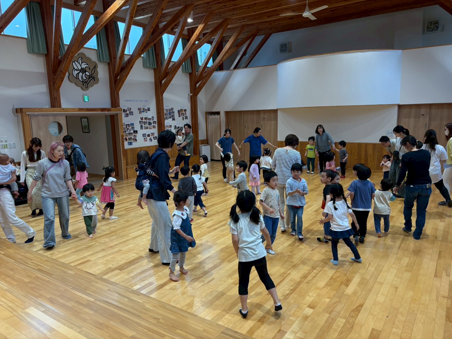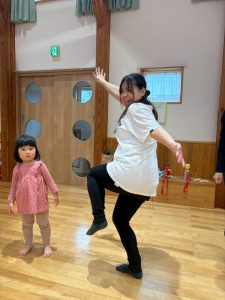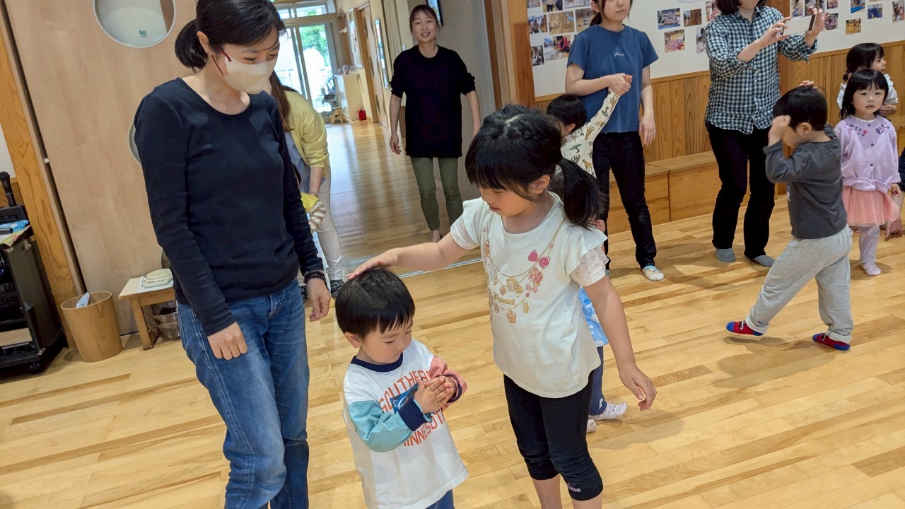 お家の方と手をつないで、“こうえんにいきましょう”のダンス。