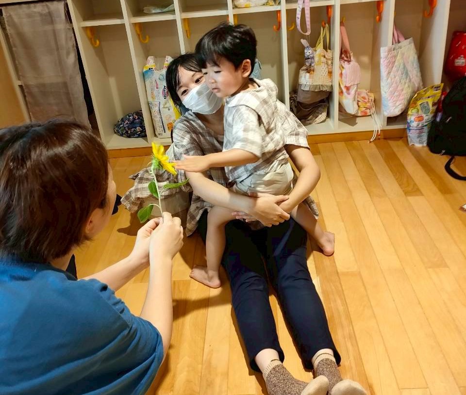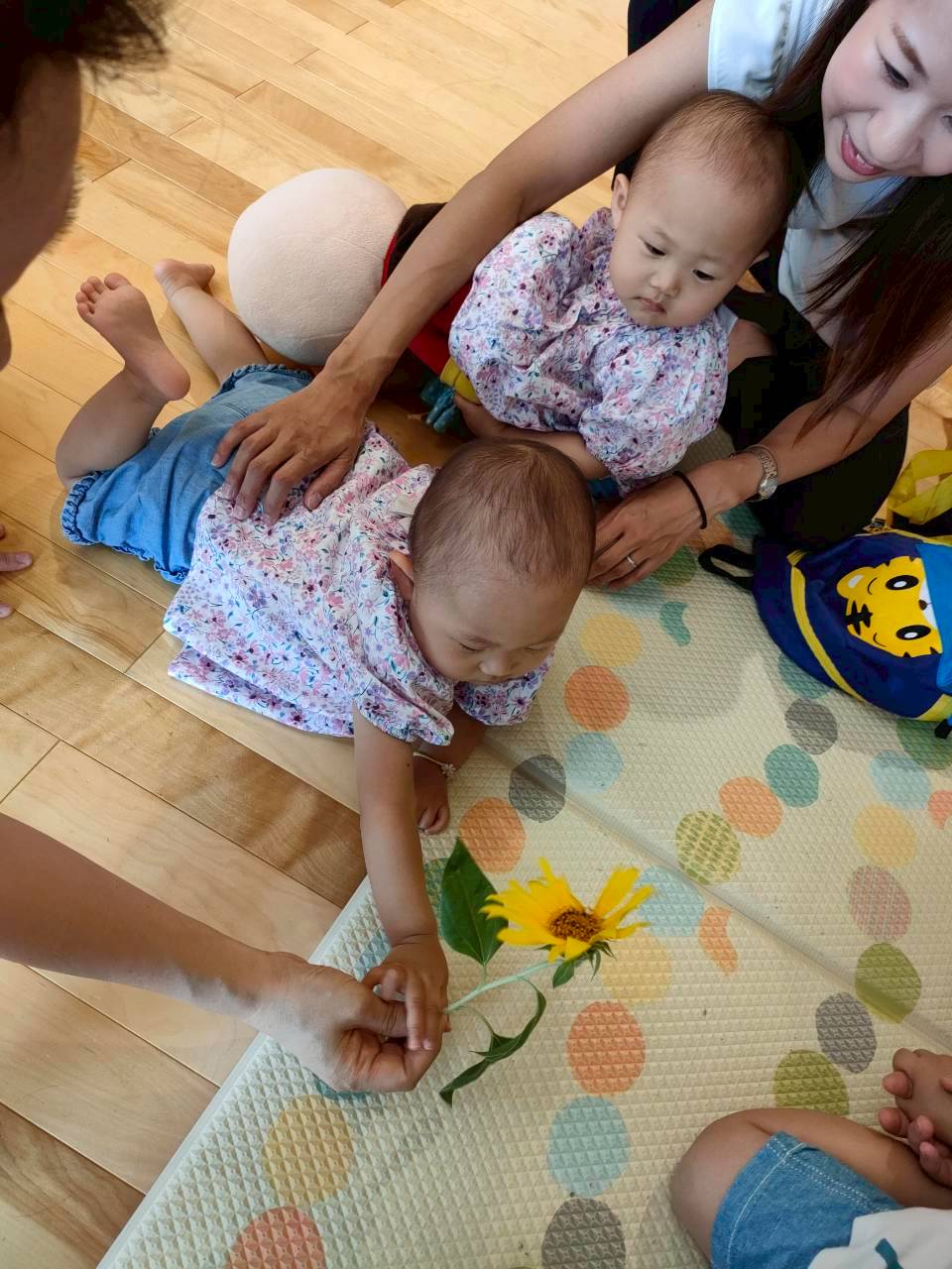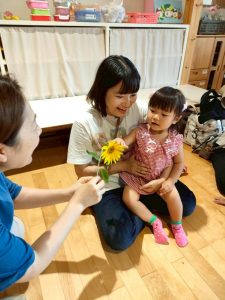 お部屋に飾っているお花を見て、「ひまわりあるね~♪」と気づいたお友だちが・・・。
