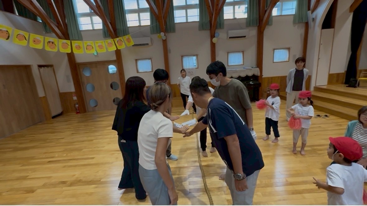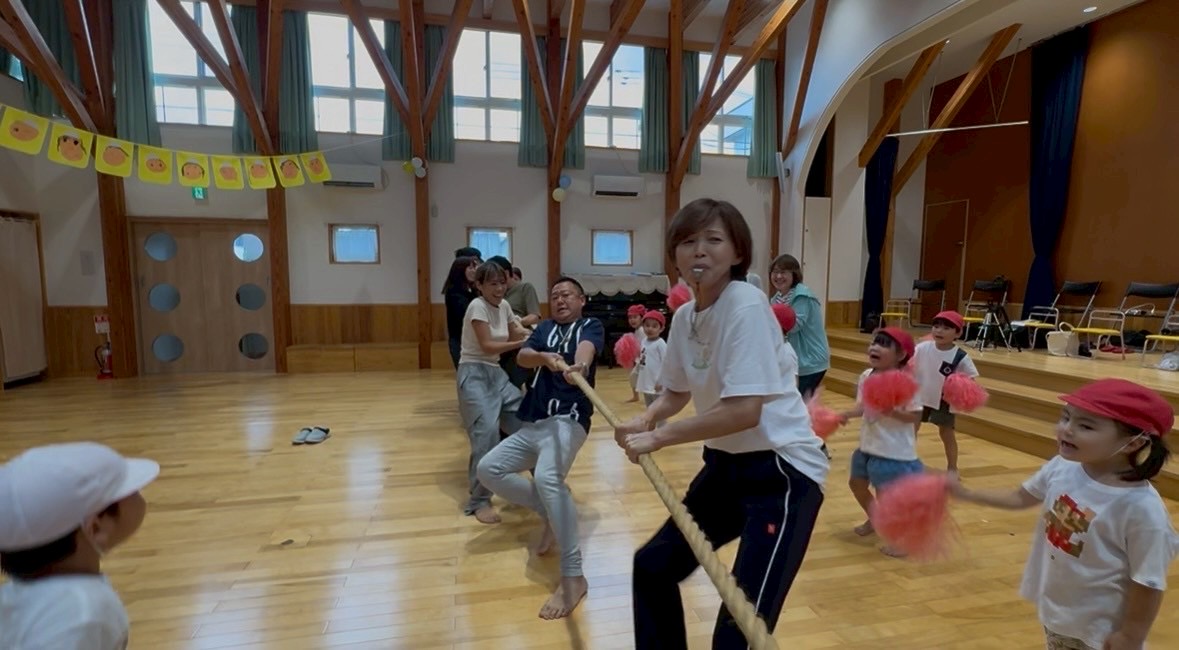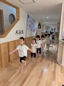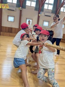 おひさま組、ひよこ組のお友だちと力を合わせて、どのチームが速いか競争しましたよ!