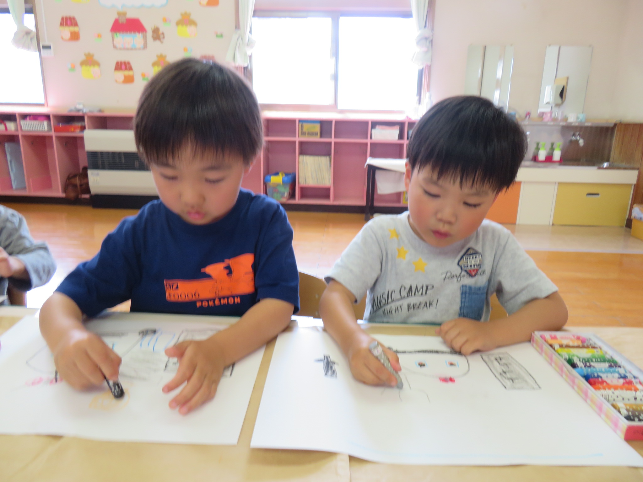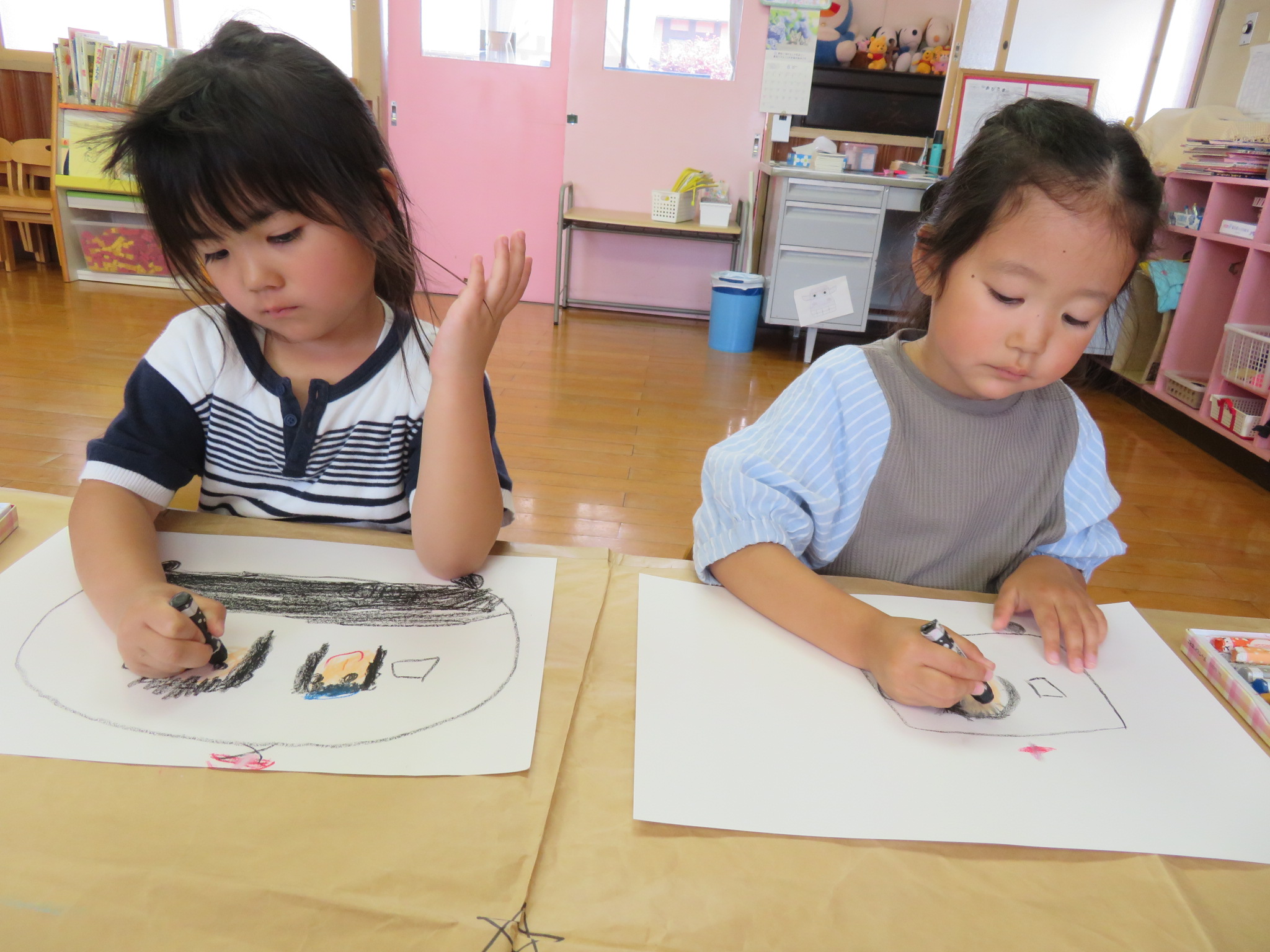 警察署に行って楽しかったことを、画用紙にお絵描きしました!