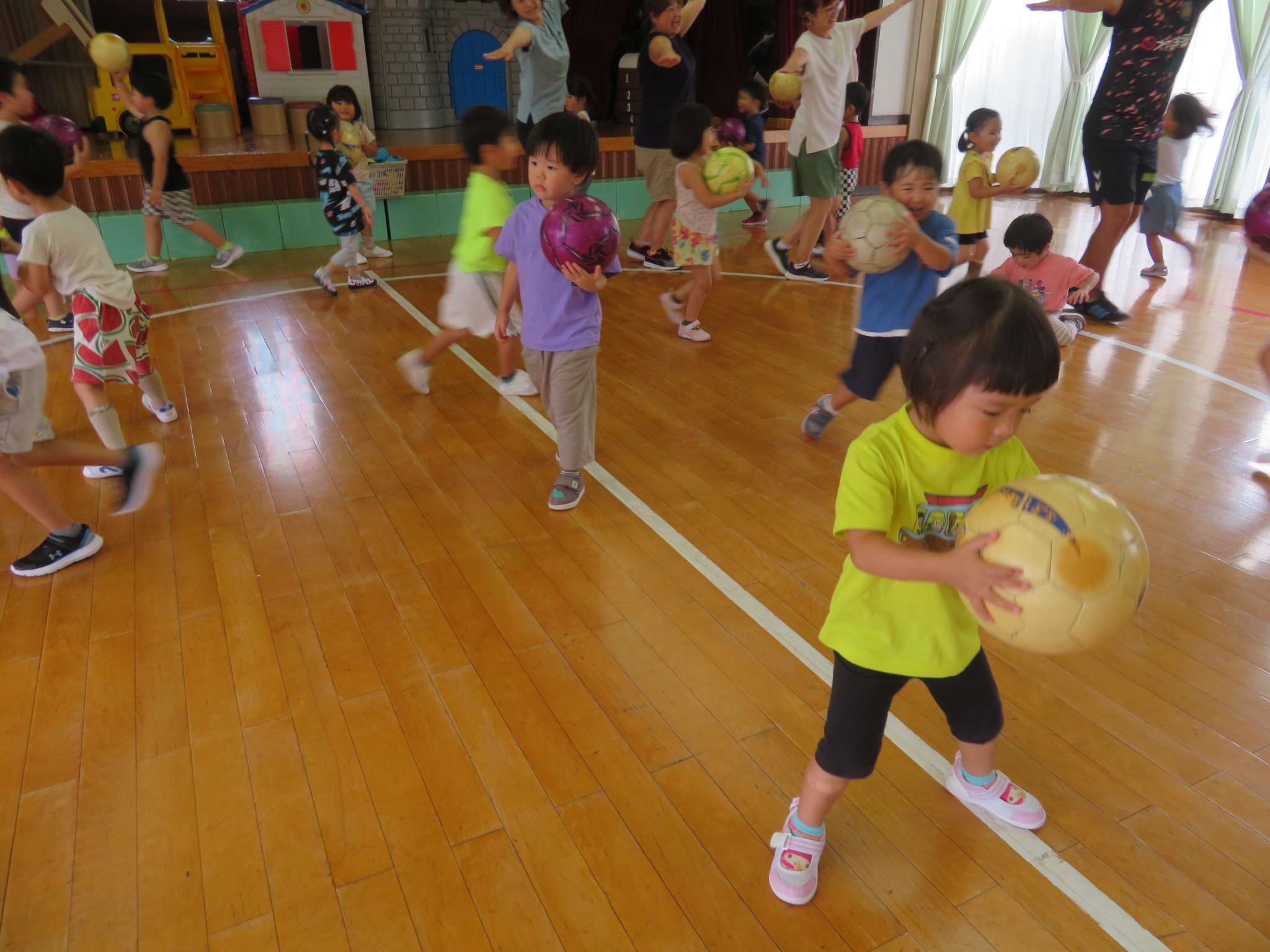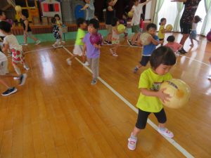 おててをお皿にして、ボールを落とさないように歩けるかな?