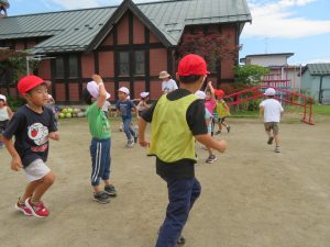 ボールで、お友だちやコーチのおしりをタッチ!