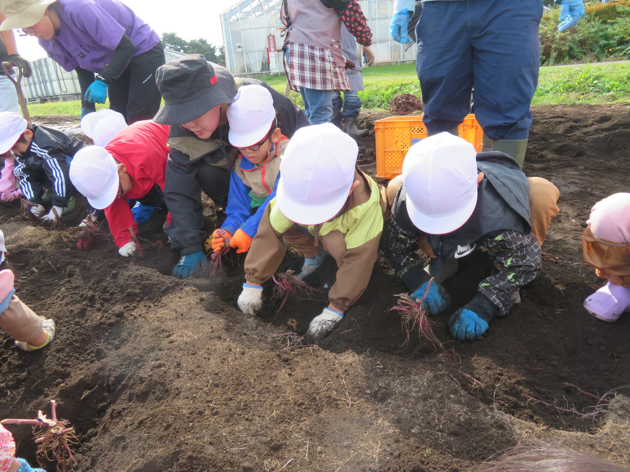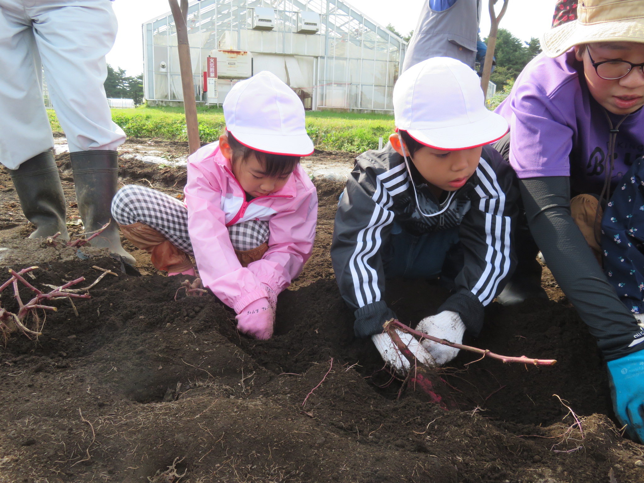 今日収穫したのは、みんなが春に植えた3種類の苗ですよ🍠