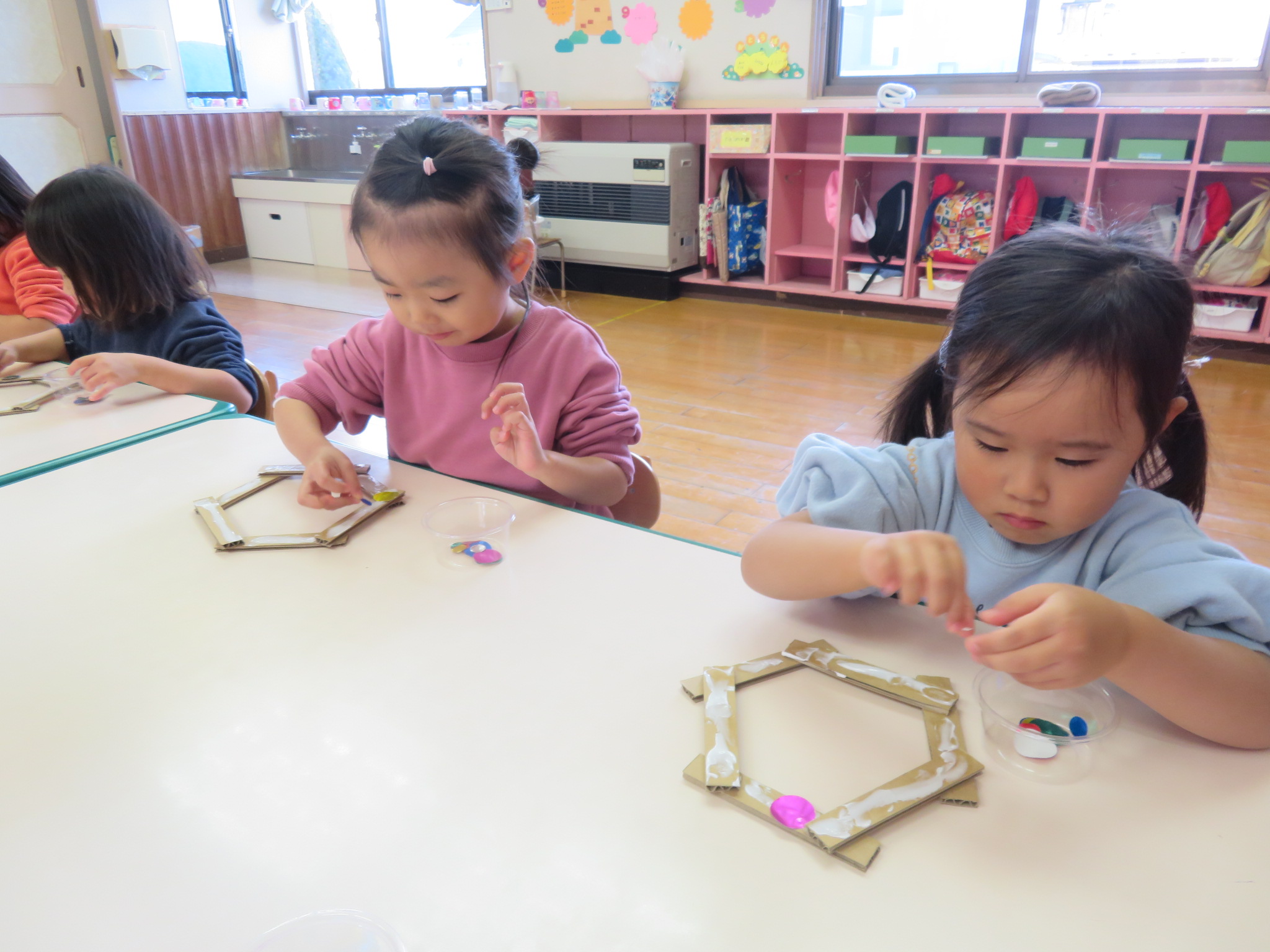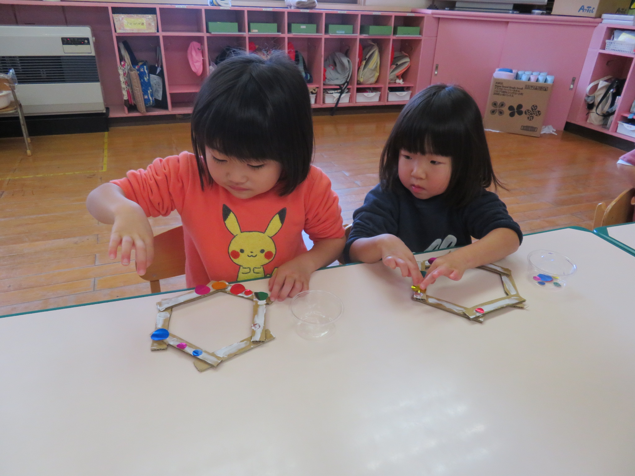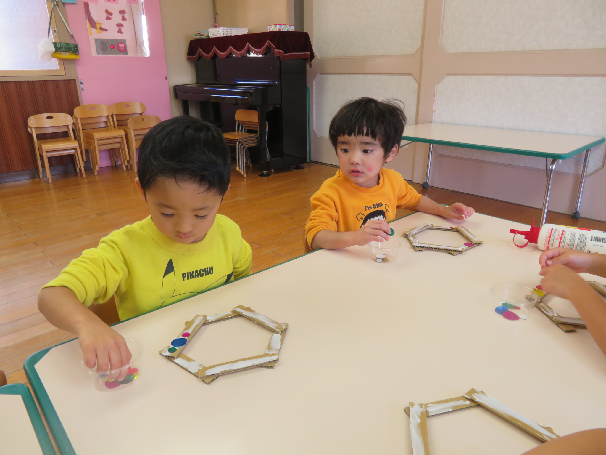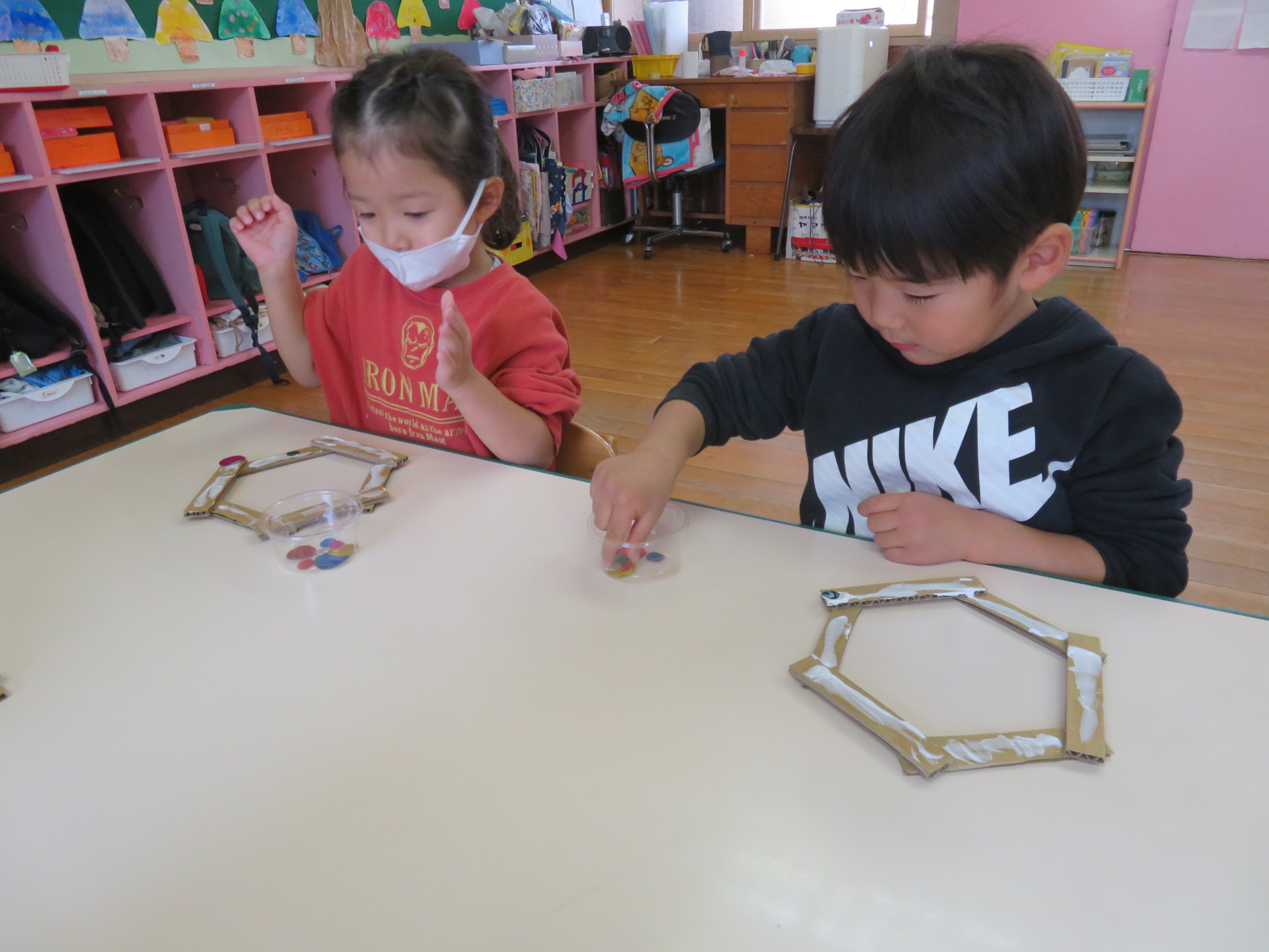 段ボールの上に、カラフルな折り紙やモールをペタペタ(*^^*)