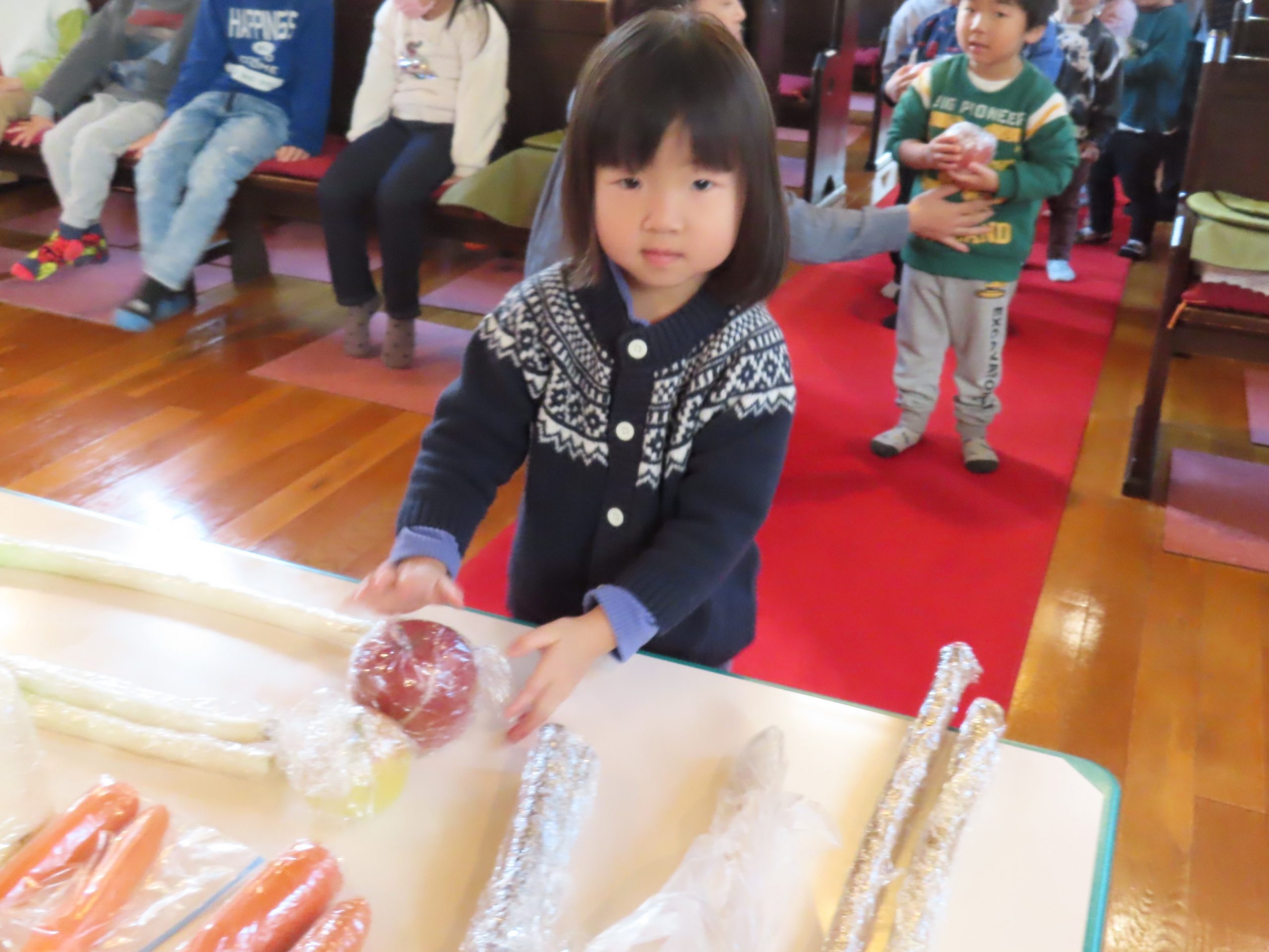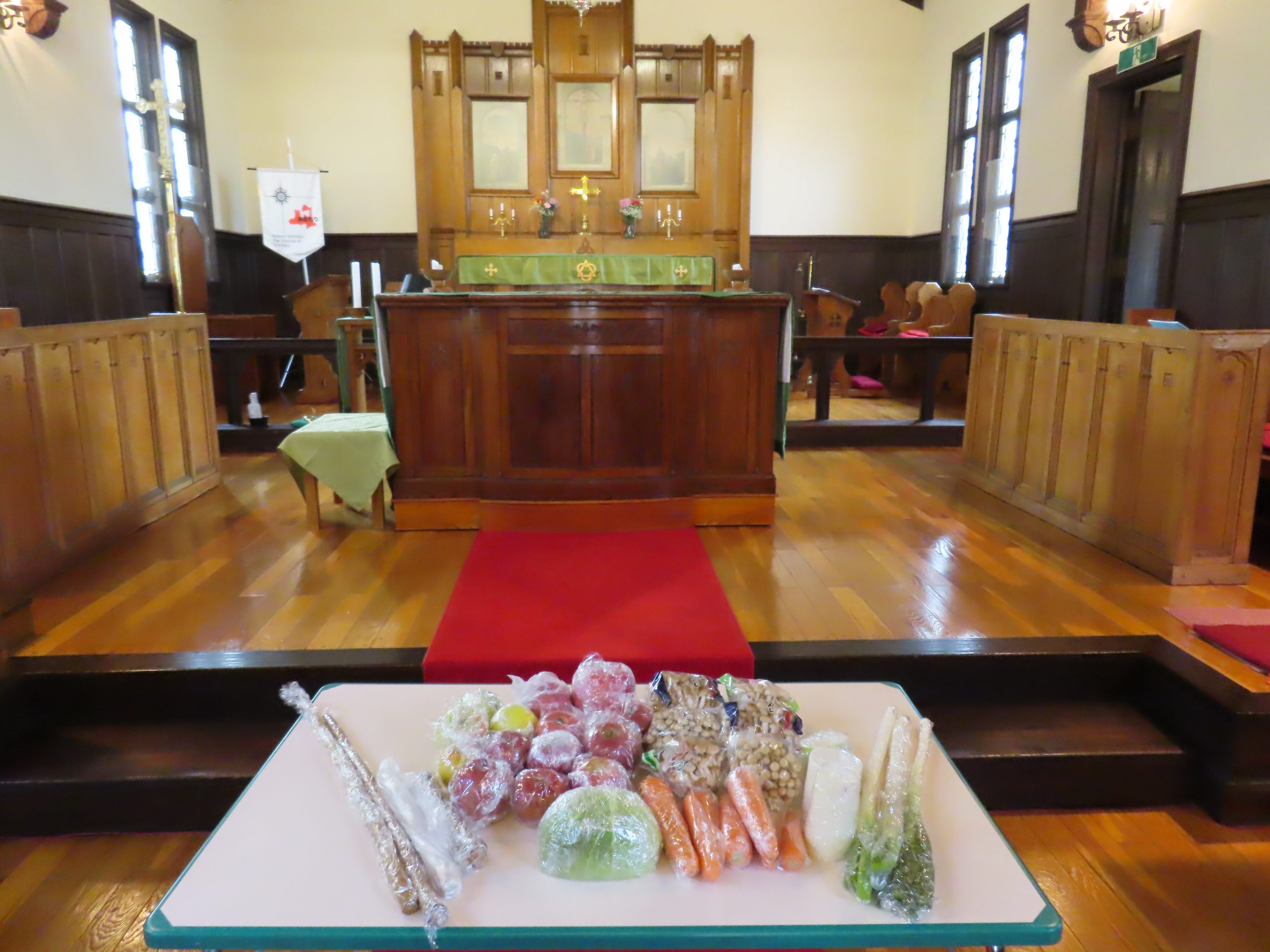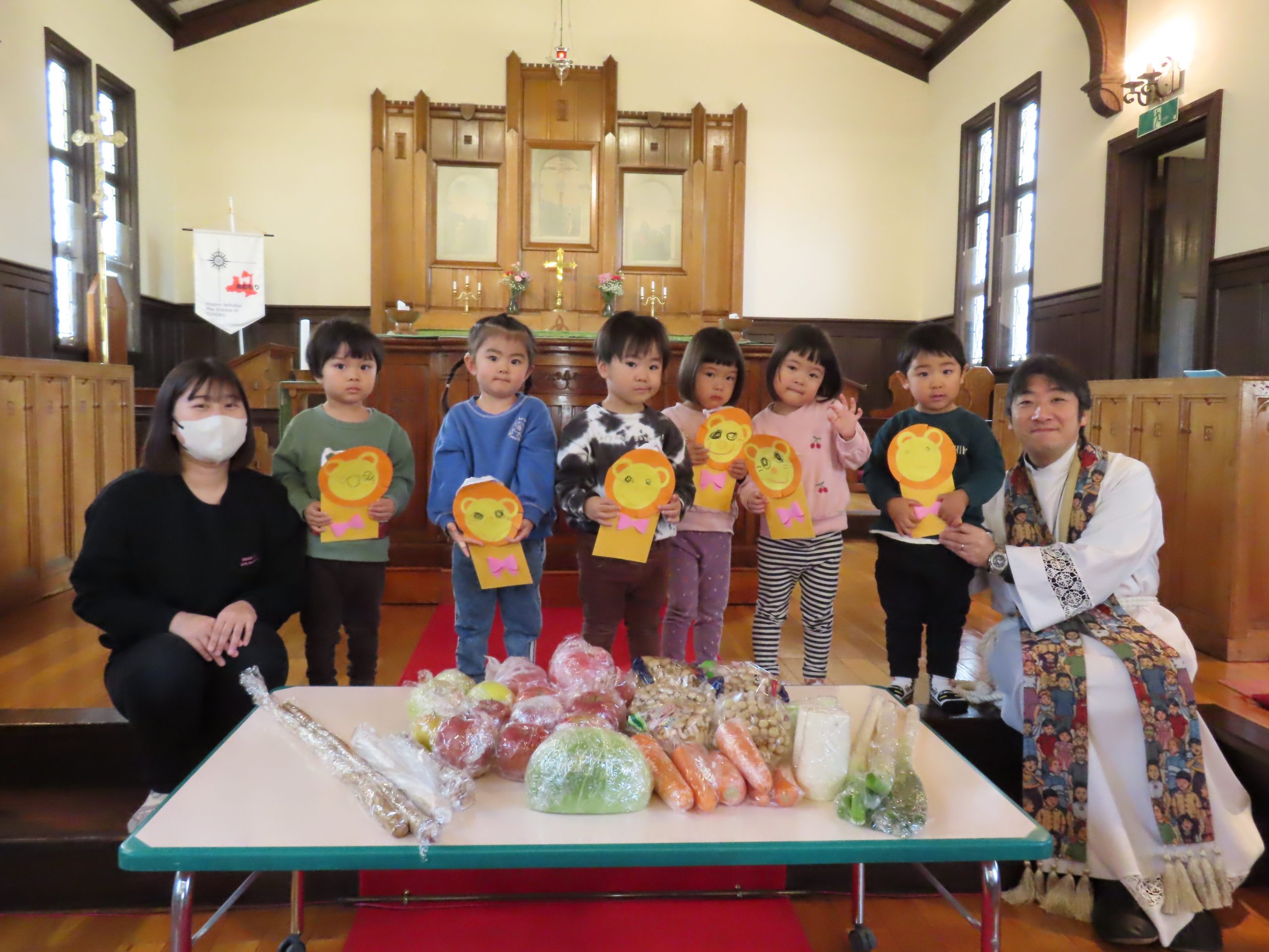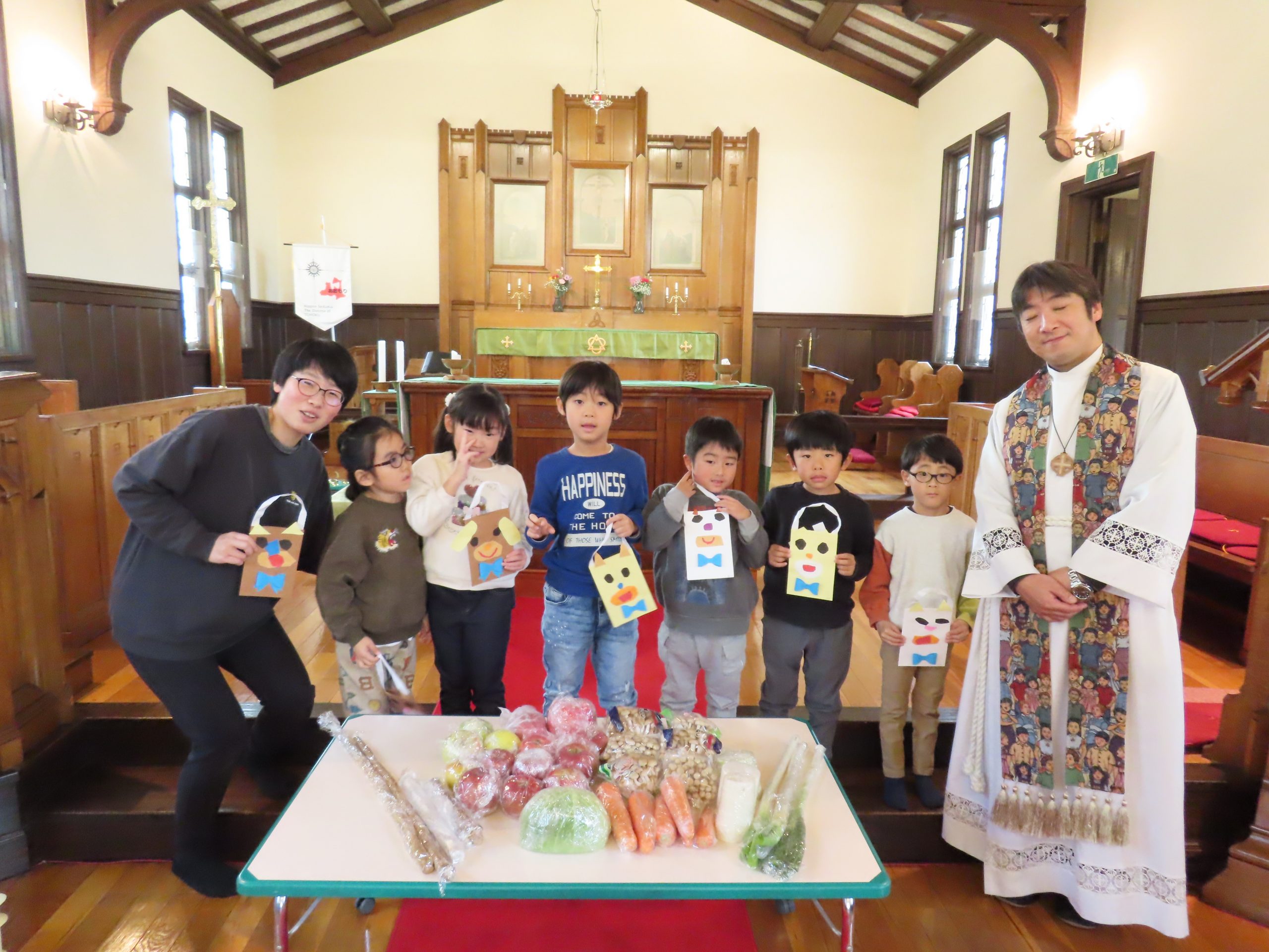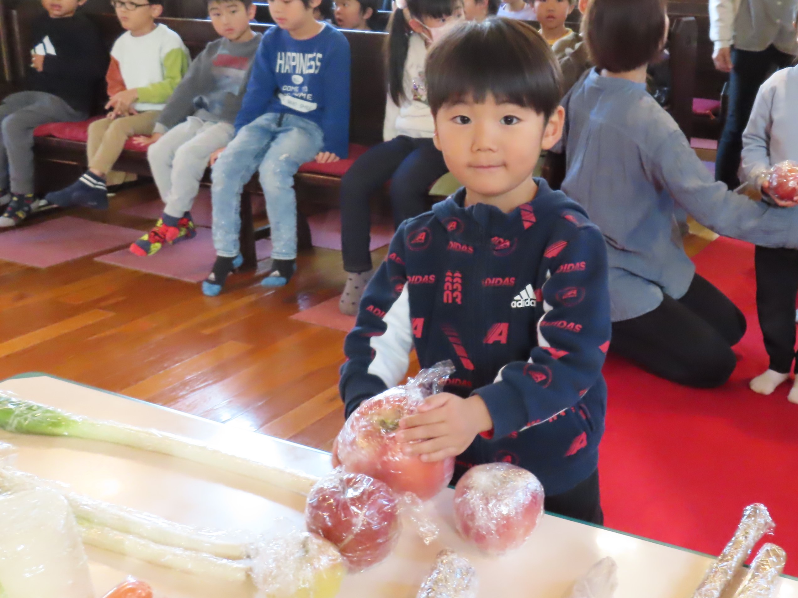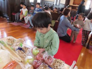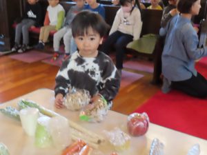 初めに、皆さんが持ち寄ってくれた野菜や果物を、お捧げしましょう。