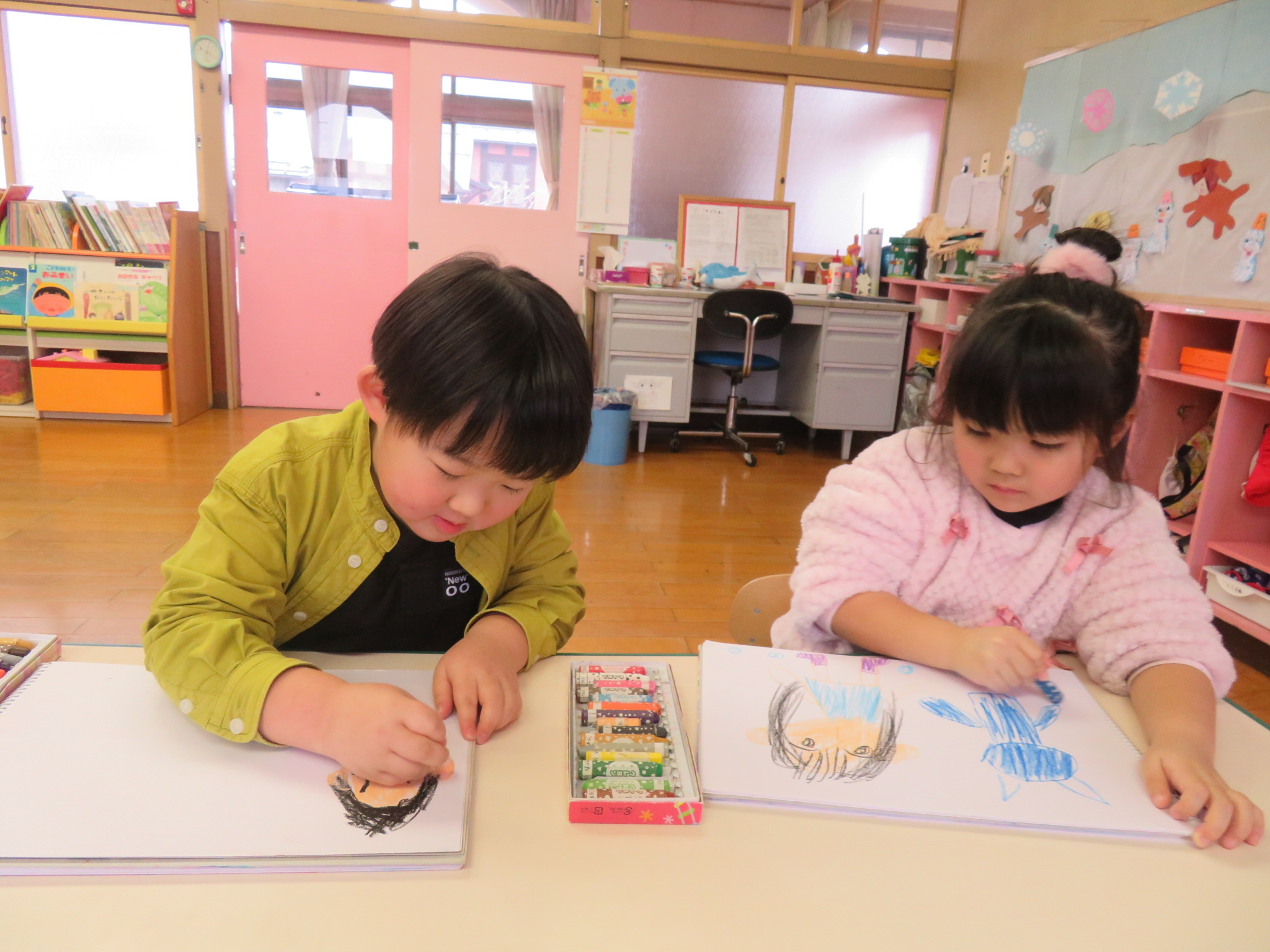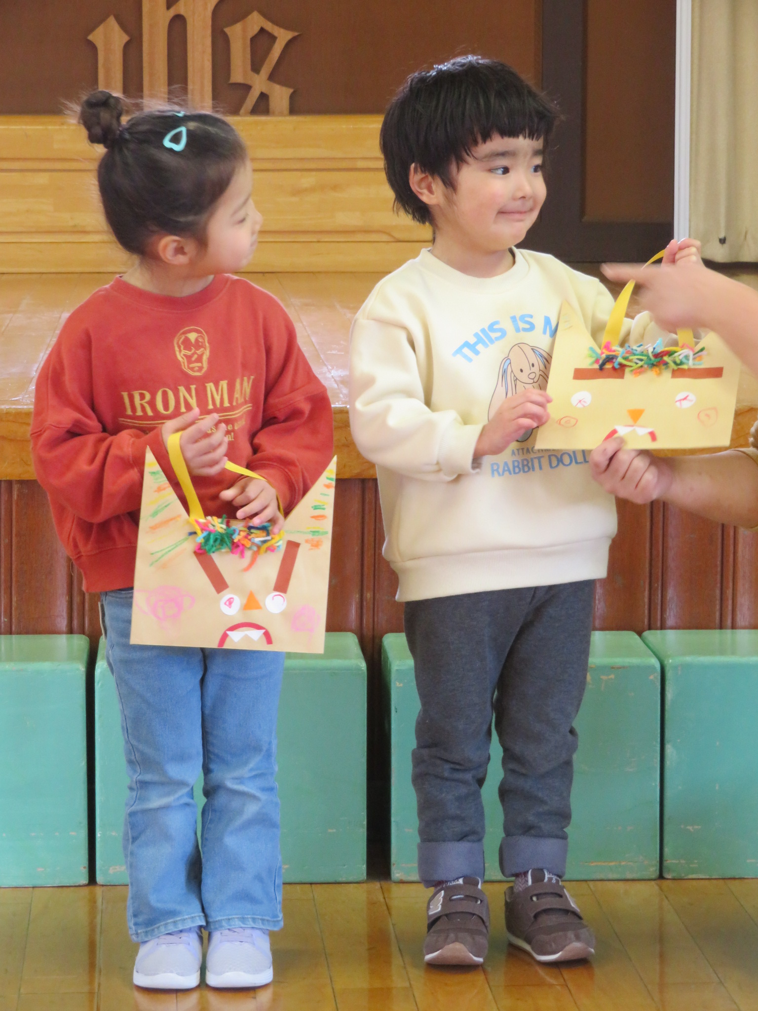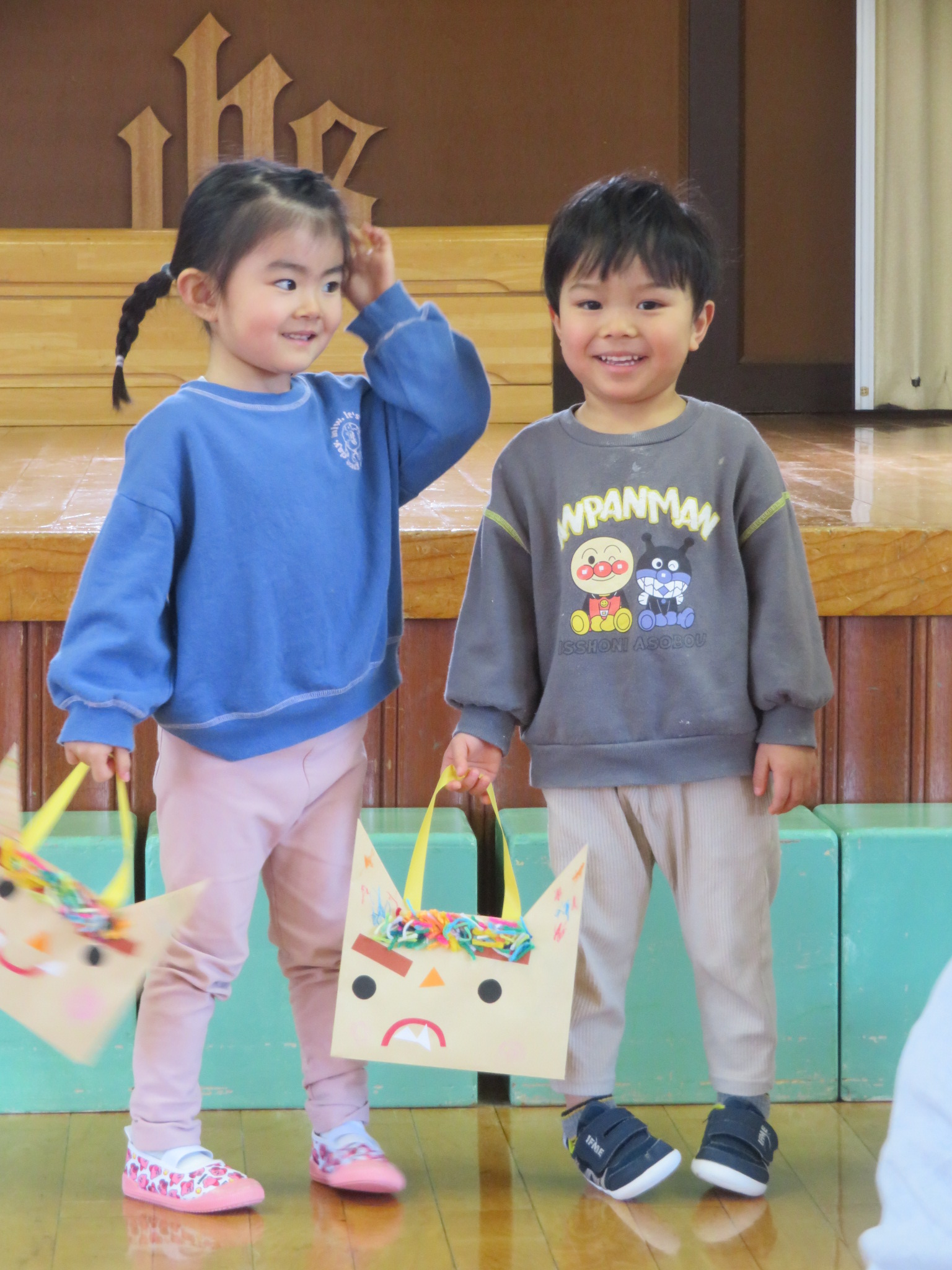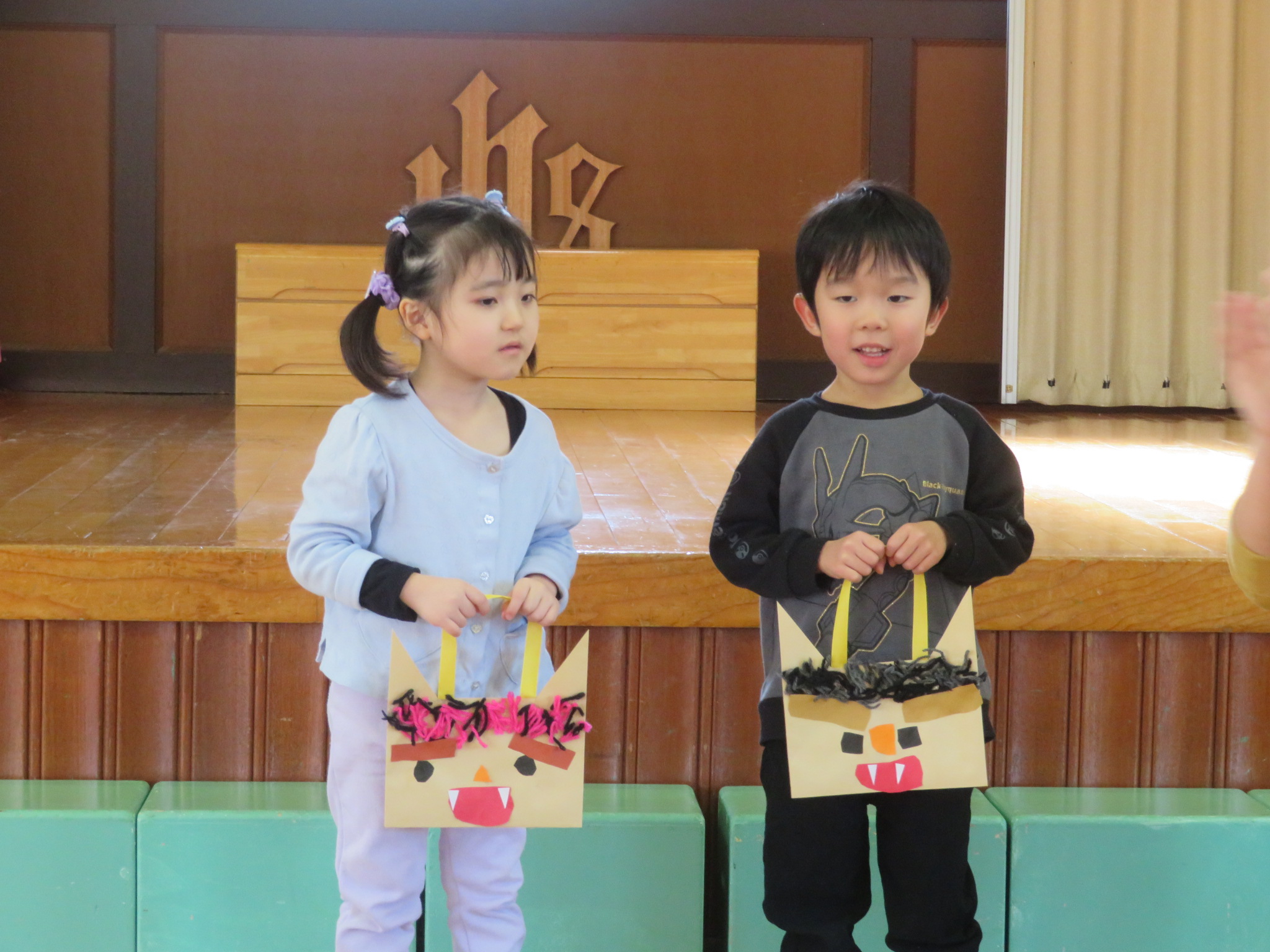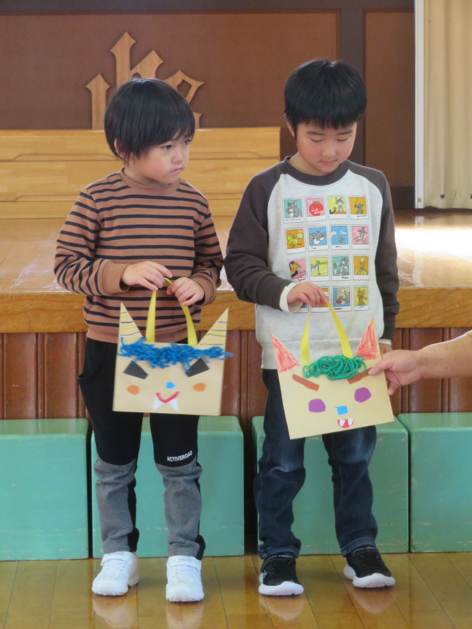 子どもたちが作った鬼の袋を見せ合いっこしましたよ(#^^#)