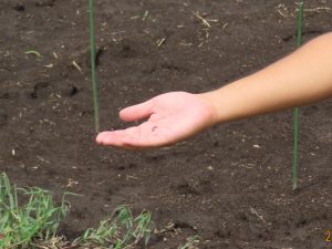 人差し指でチョンと穴をあけたら、そこに種をコロリン!
