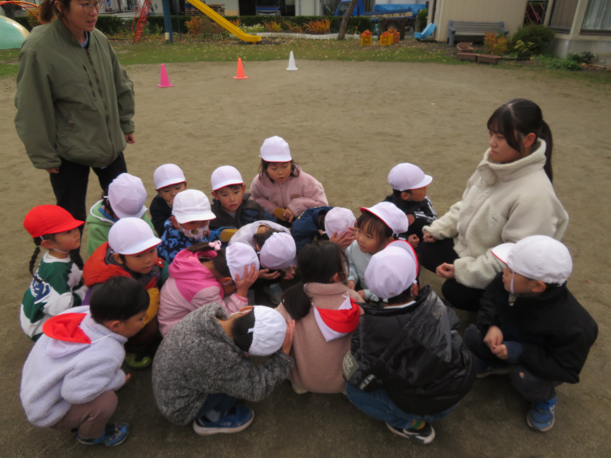今回は、お外で遊んでいるときに地震が発生したという想定での訓練です。