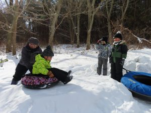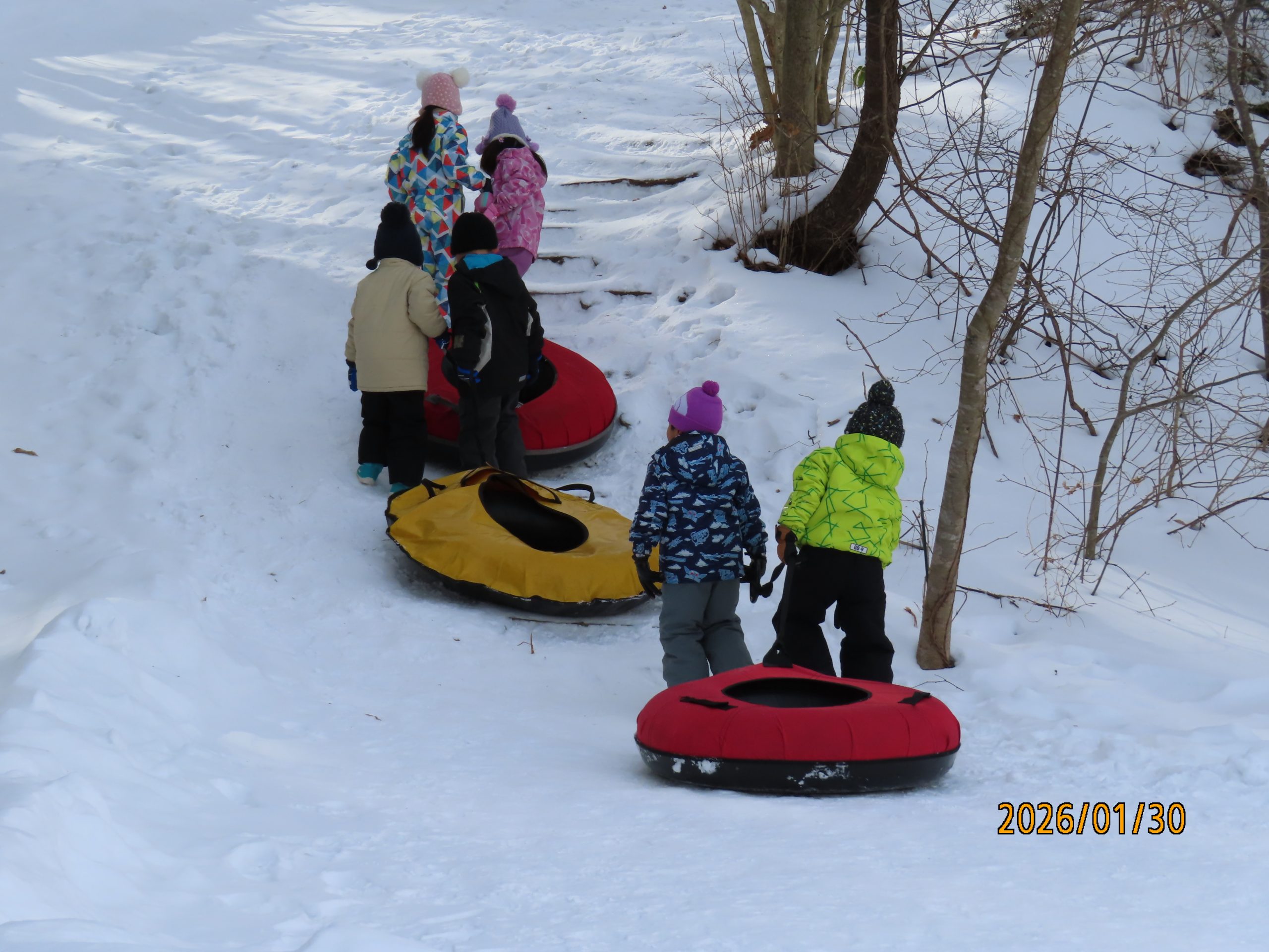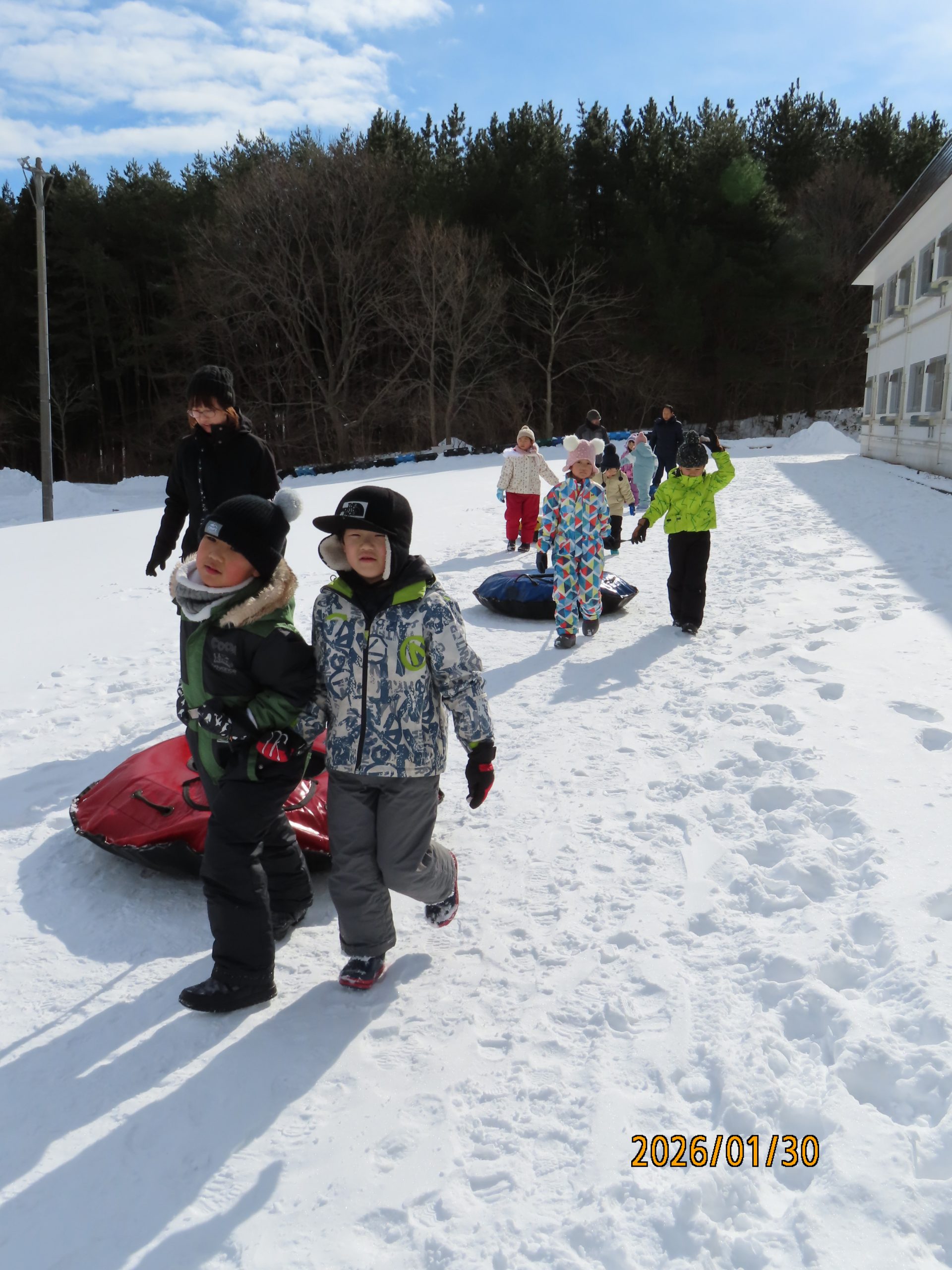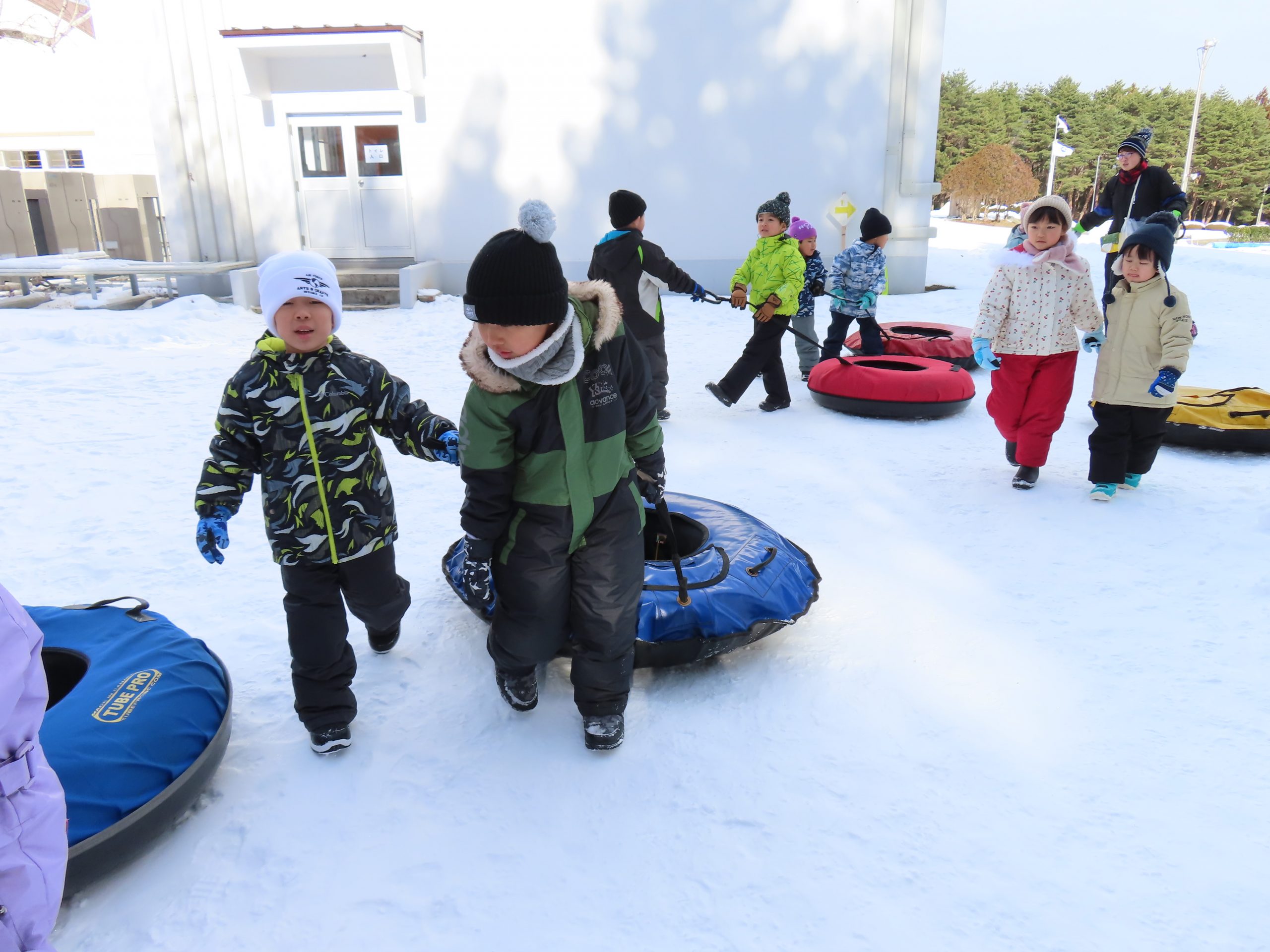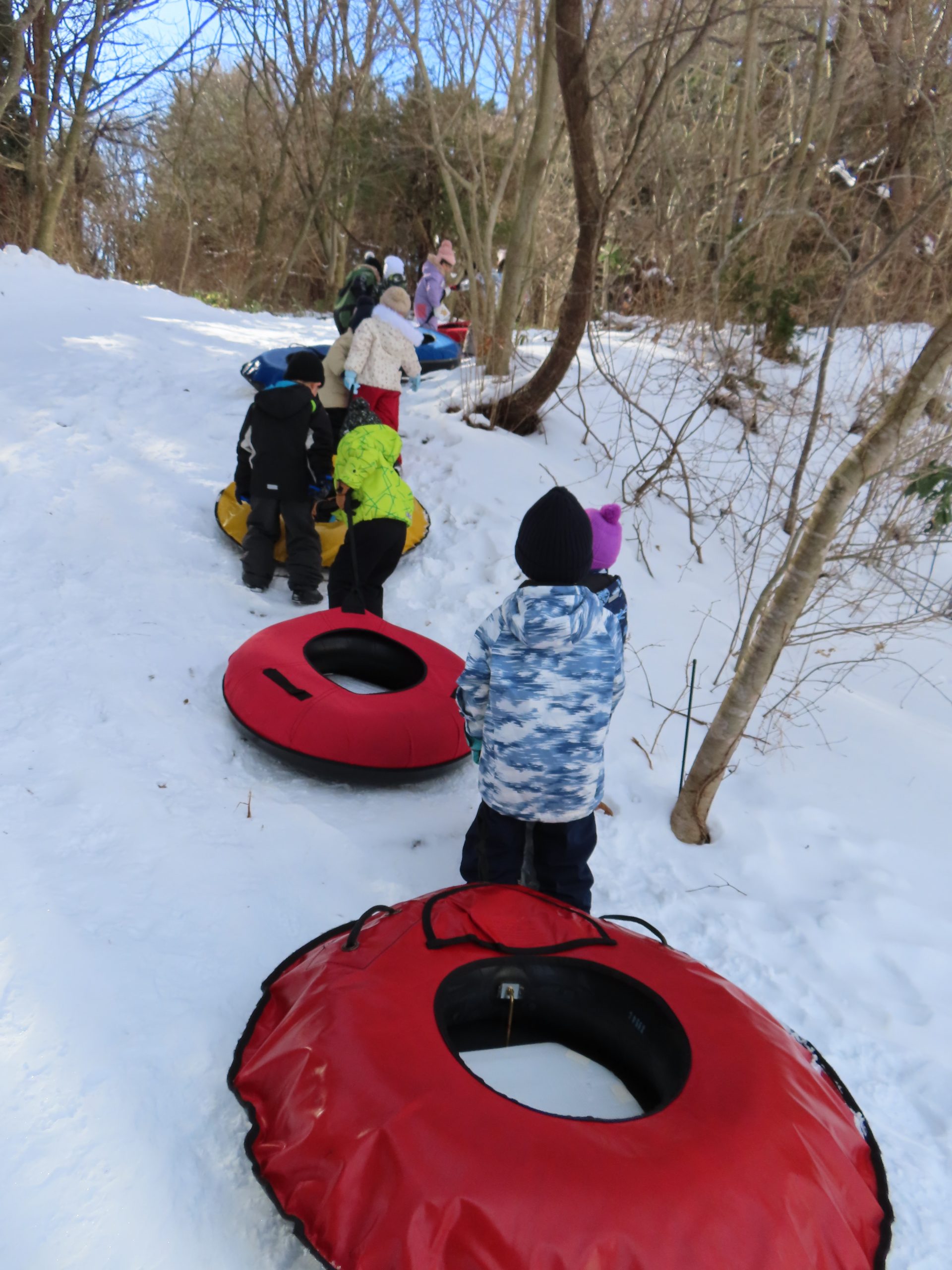 自分たちが乗るスノーチューブを、お山のてっぺんまで運びます!