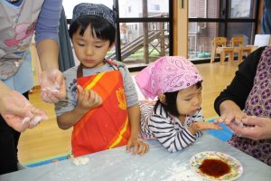 「ぺったぺったぺったぺったおもち~♬こねこねこねこね~」
