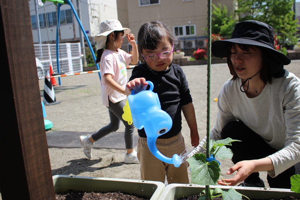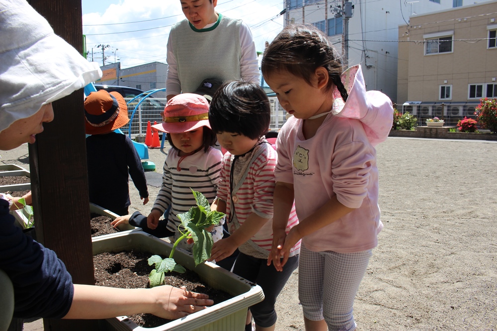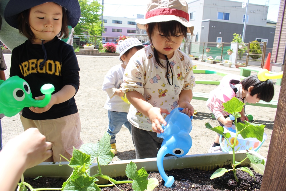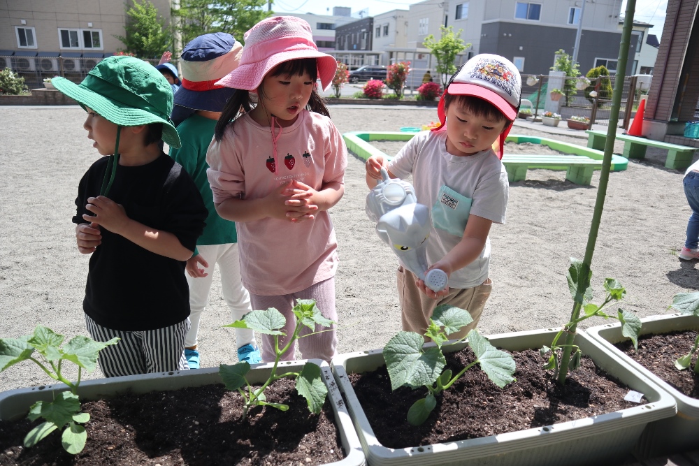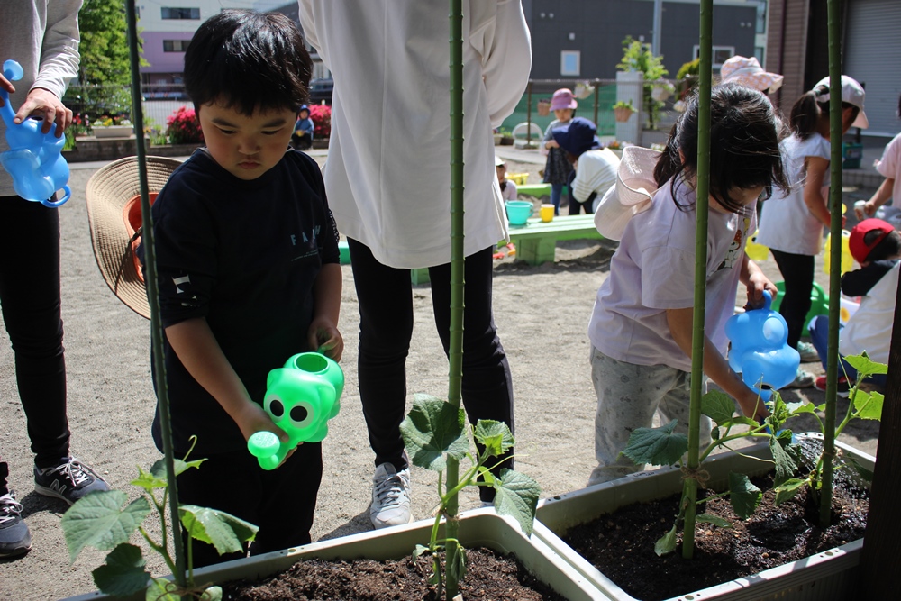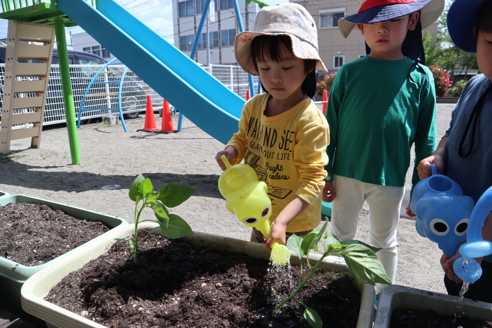 《昨年豊作だったピーマンを今年も引き続き作ることにしたちゅうりっぷ組さん😆✨大好きなきゅうりも植えました🌱大きくな~れ!と水やり当番、がんばるぞ~~!🔥》