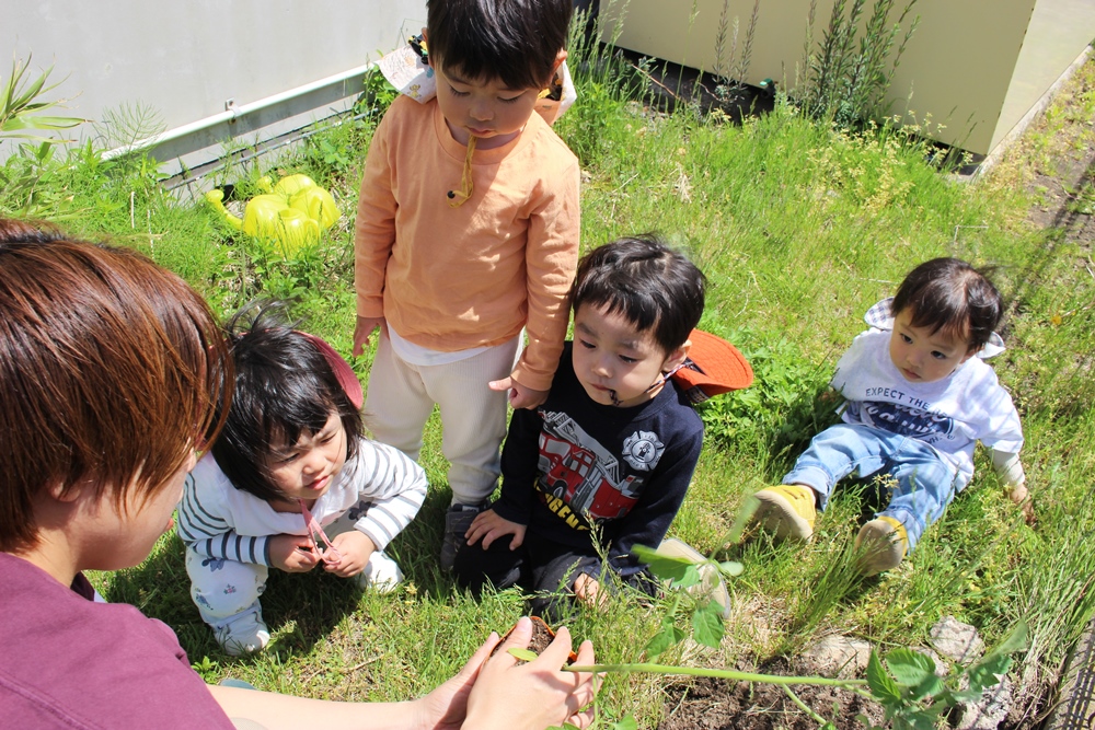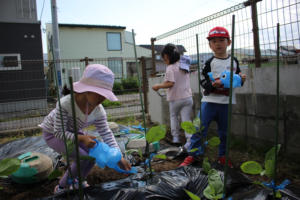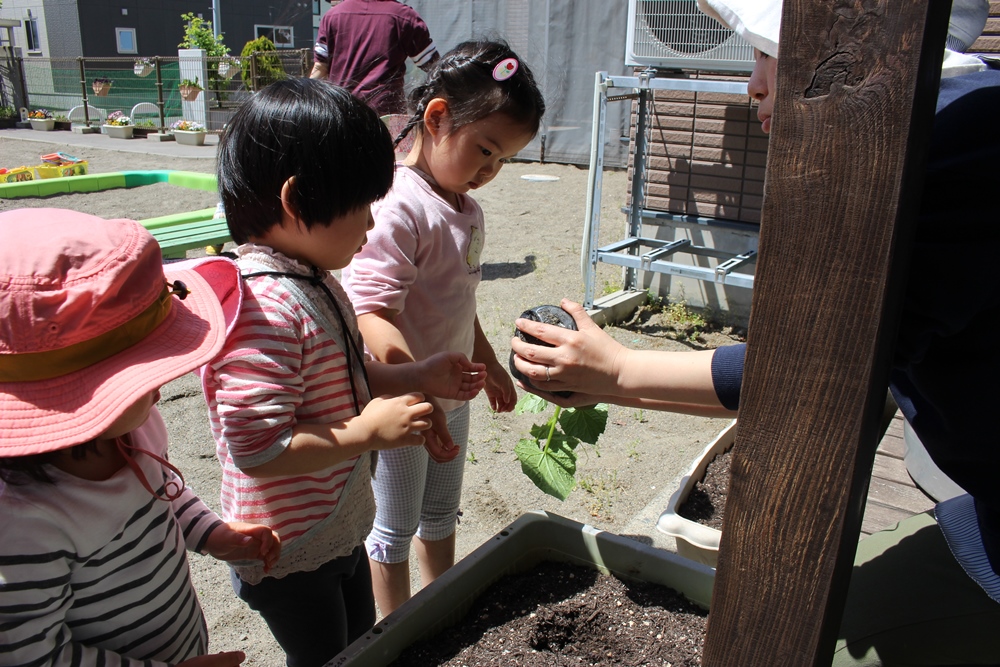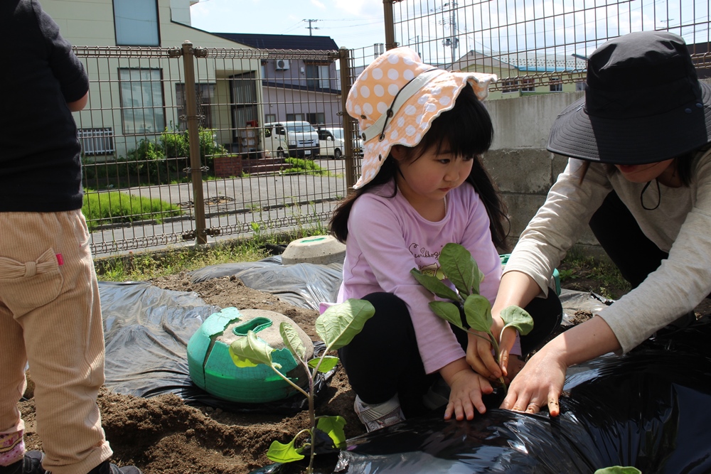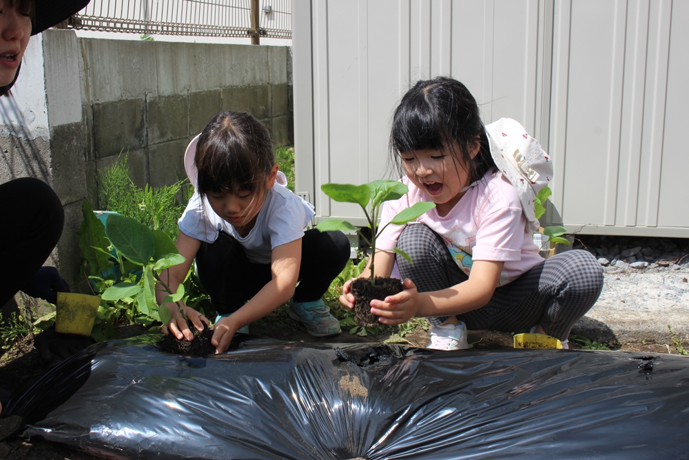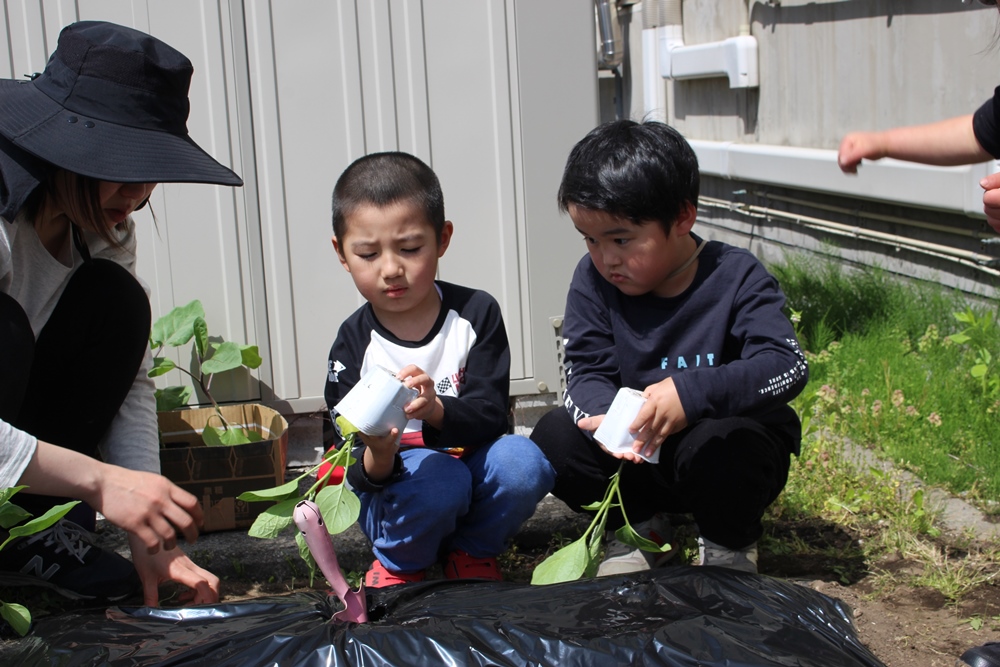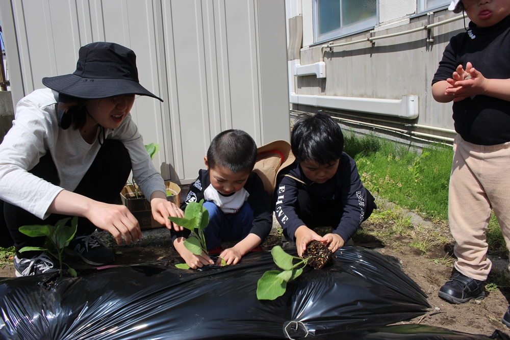 《おひさま組では今年、4種類のなすを育てるという初の試みに挑戦🍆🔥同じ野菜でもこんなに違う⁈成長の変化や調理方法を変えての食べ比べ等を計画しています😋♬年長児ならではの内容で育てながら学び、神さまのお恵みを存分に味わいたいと思います✨》