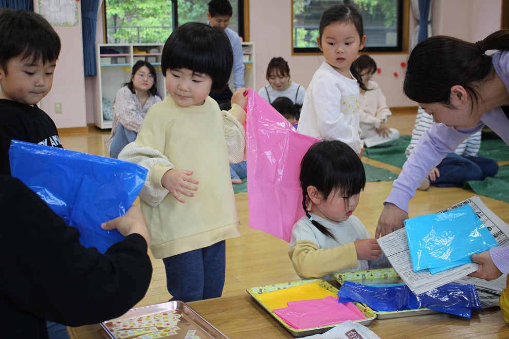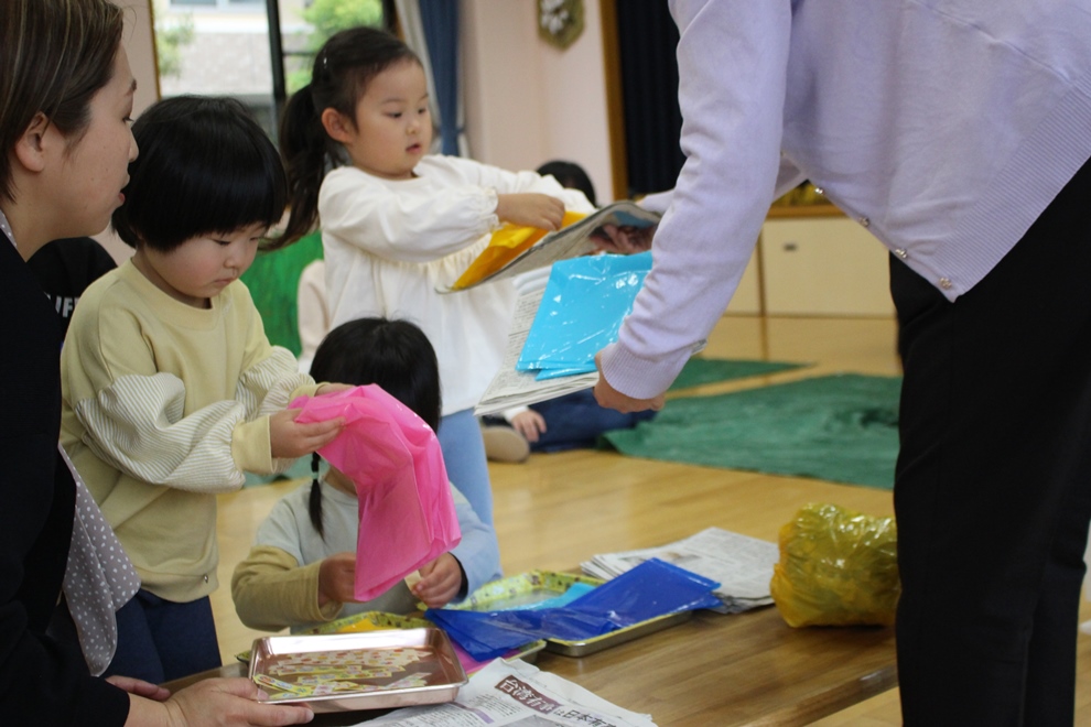 新聞紙をくしゃくしゃして、カラービニールでつつんだら…✨