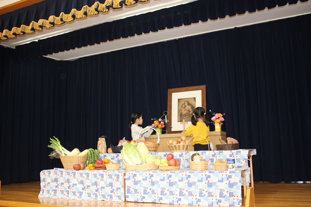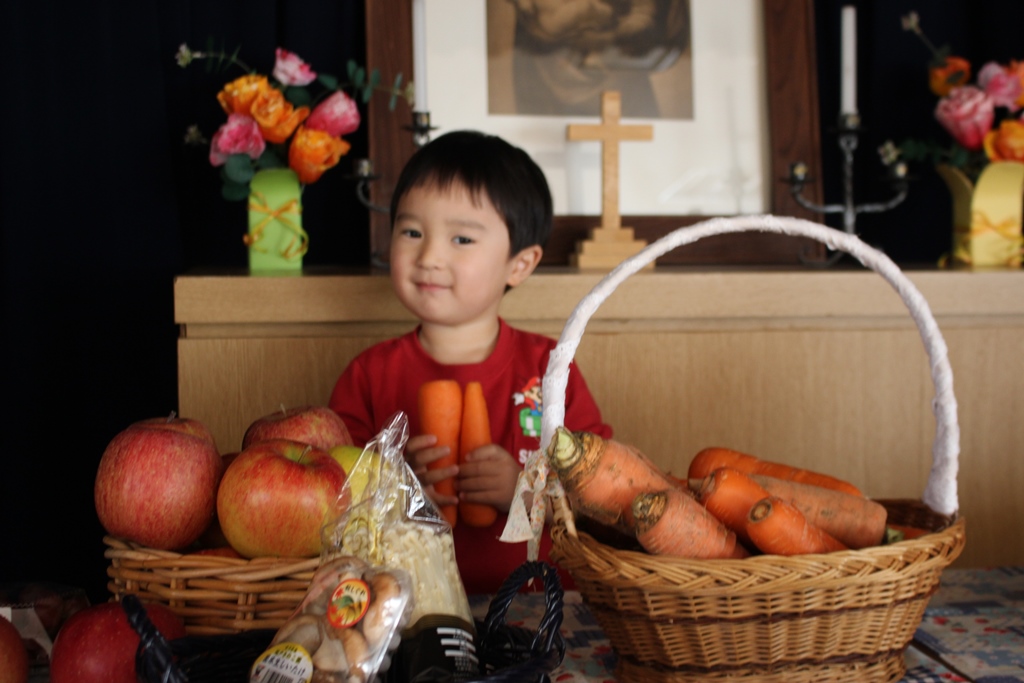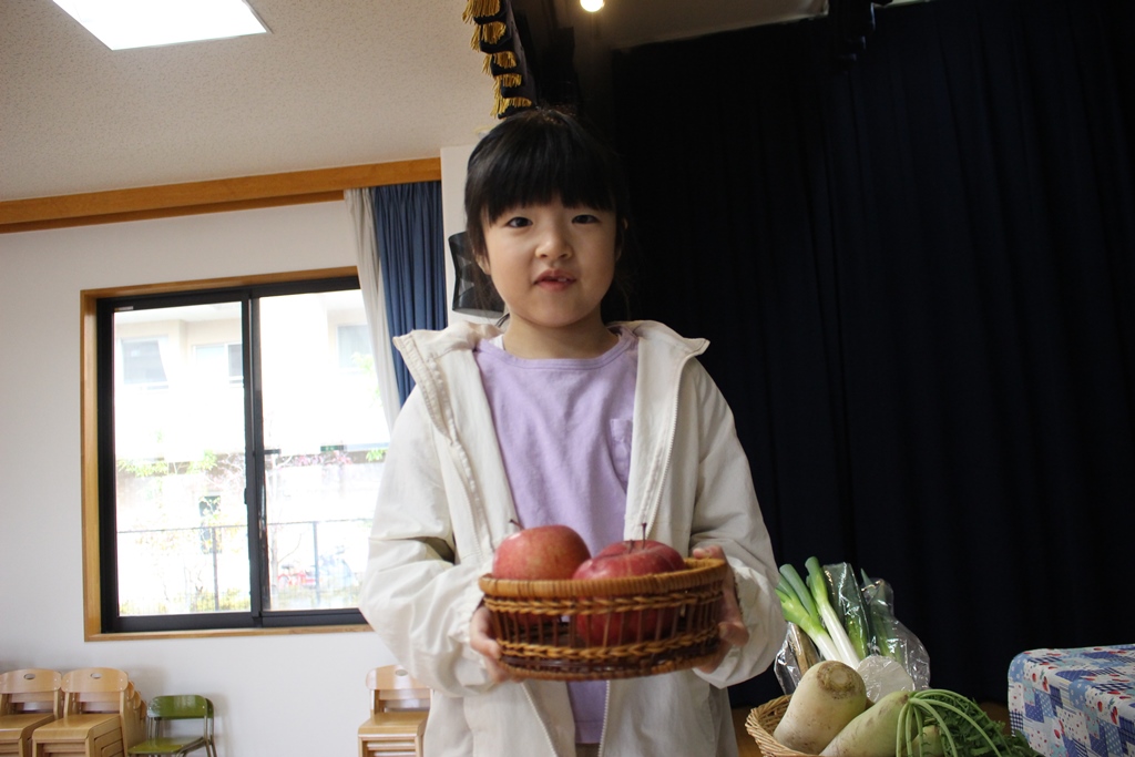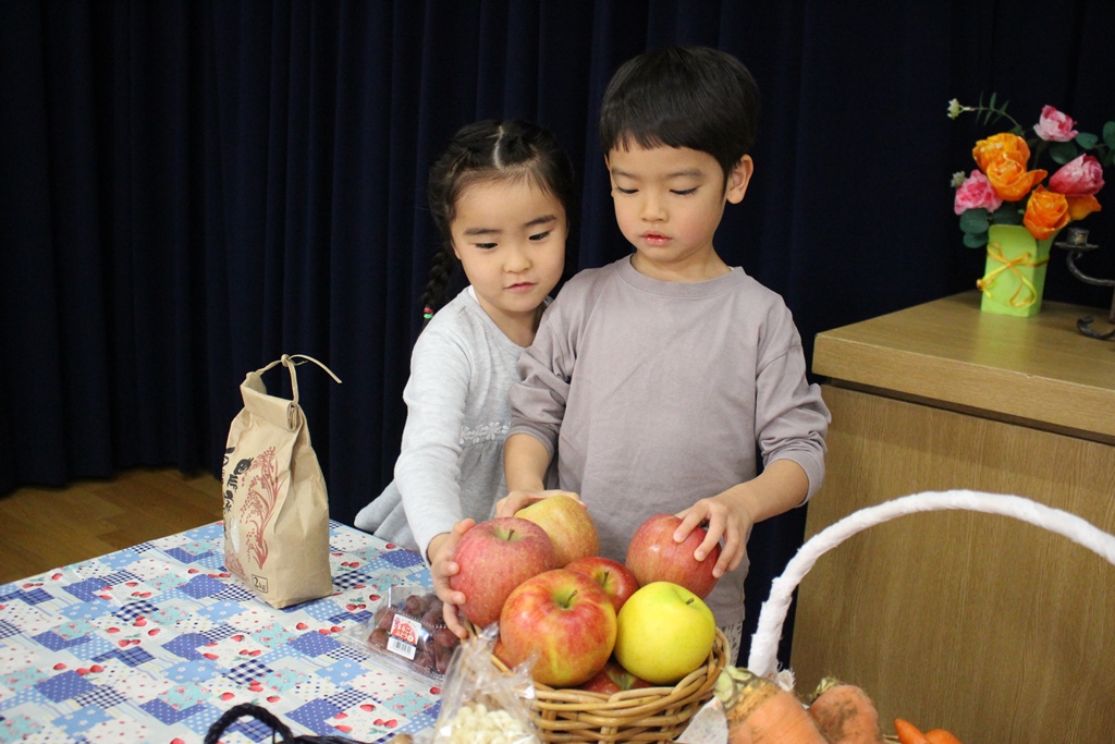 ご家庭から秋の野菜や果物をお捧げいただき