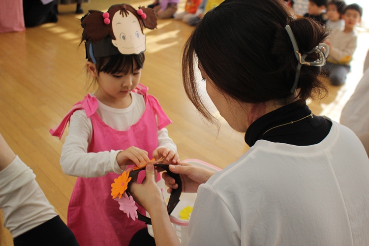 次は、めいちゃんが摘んだお花で、お花の冠作りです🌼