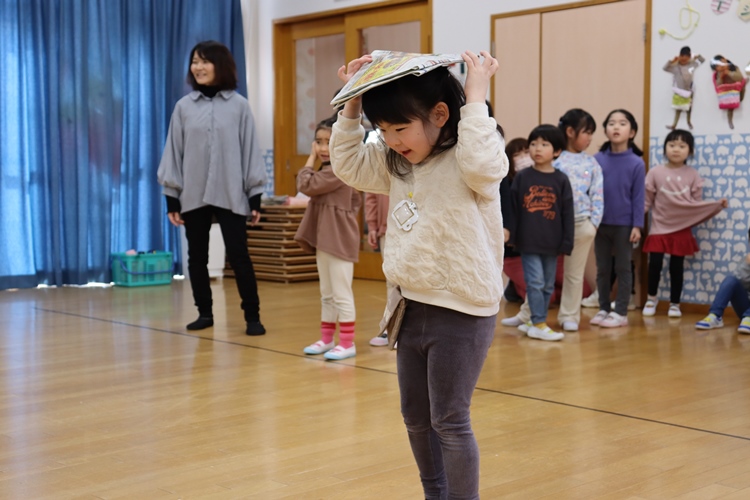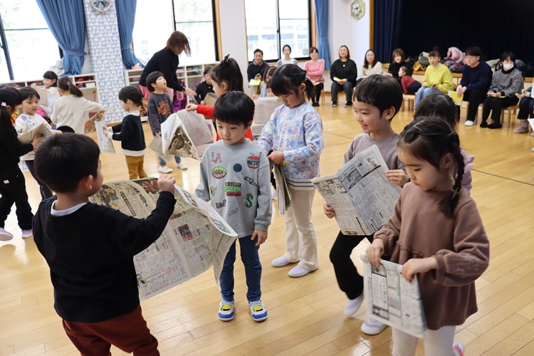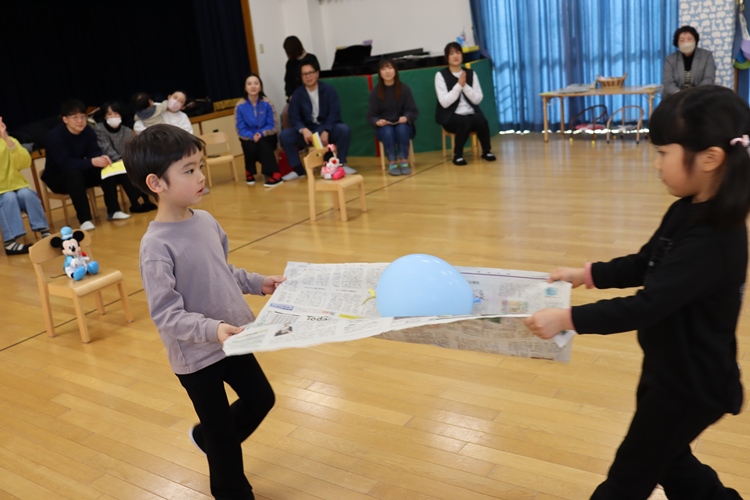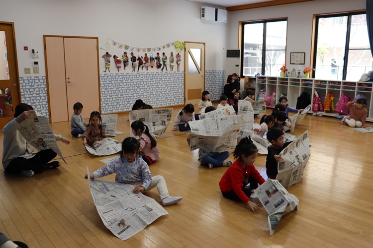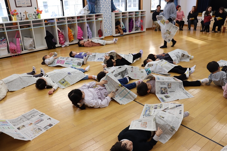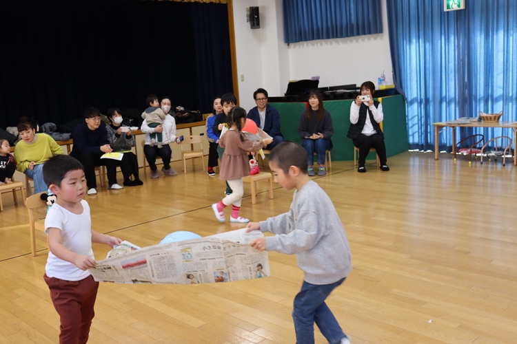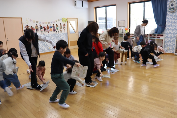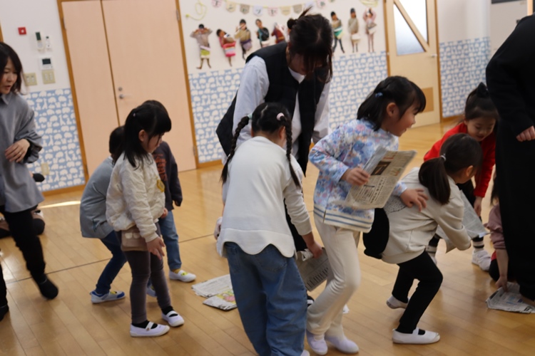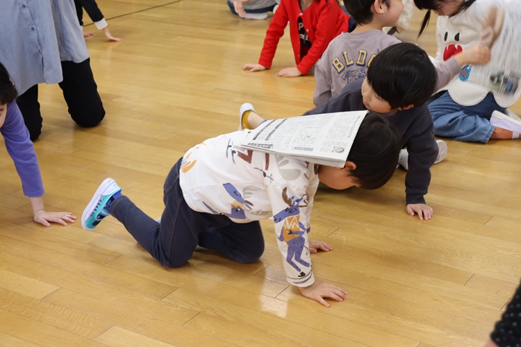 次は、おうちの方を海に落とさないように、島に見立てた新聞紙繋ぎ競争です!