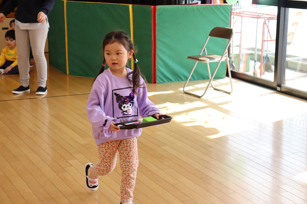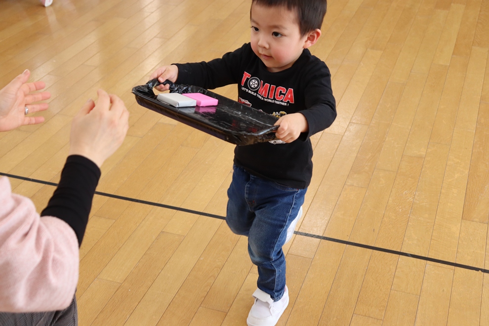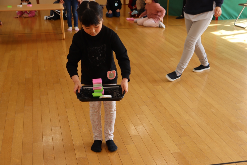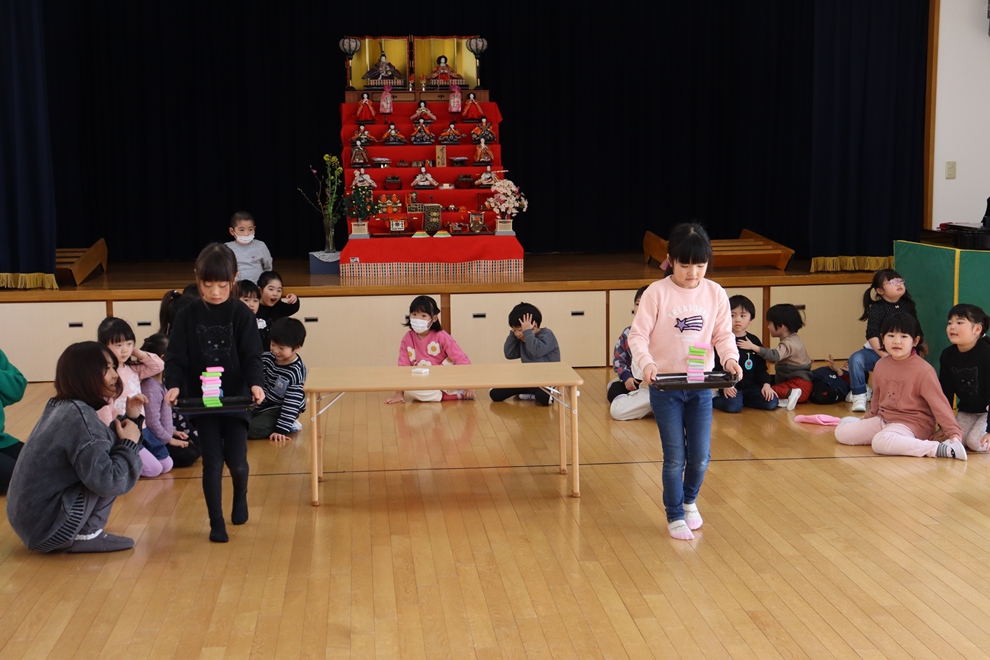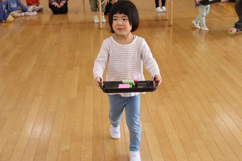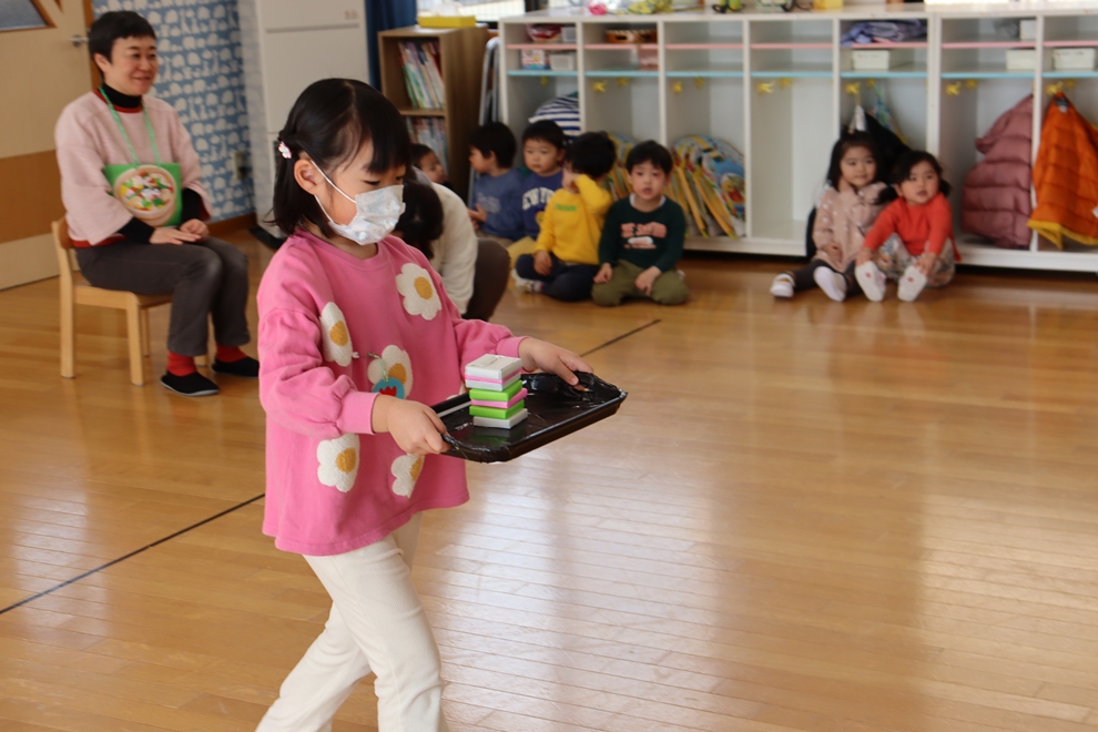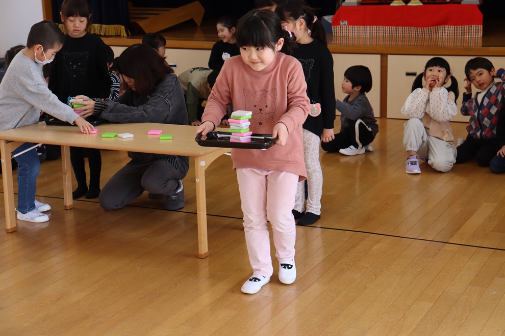 おぼんにひし餅を一個ずつ乗せて、上手に運べるかな!?