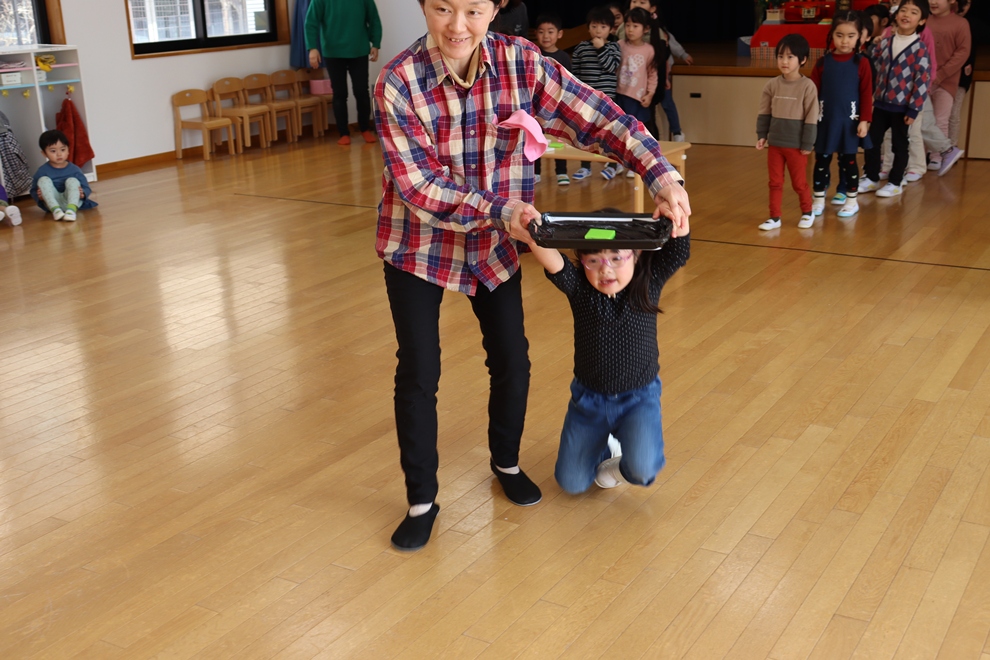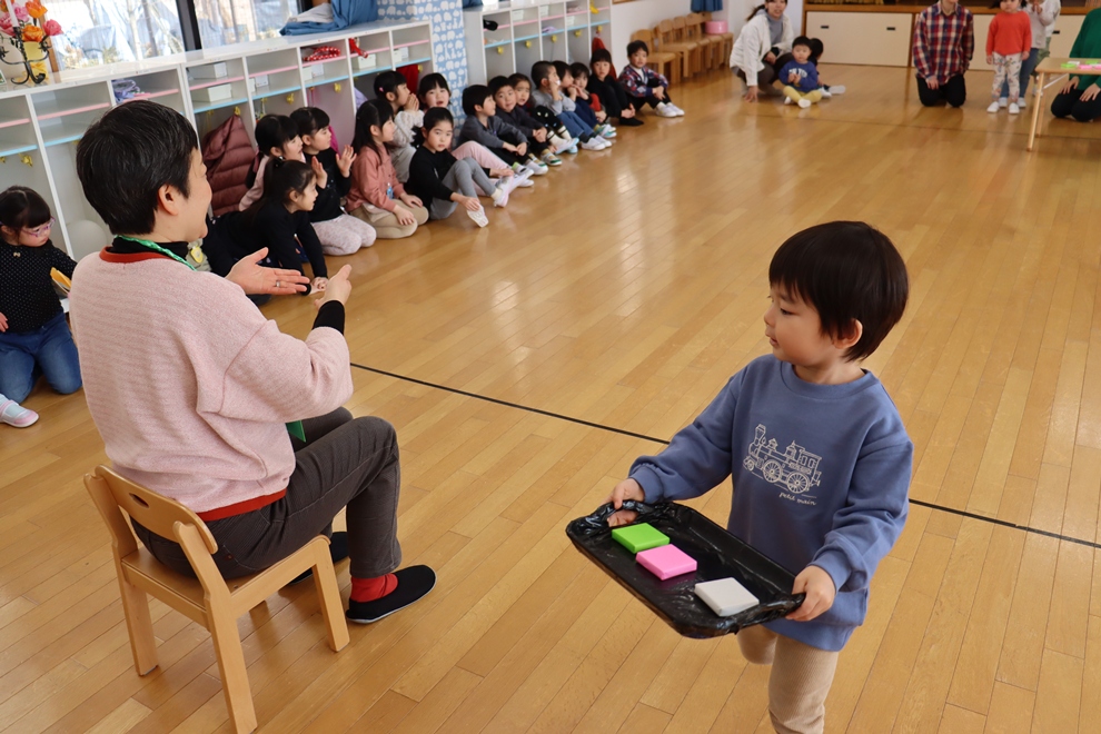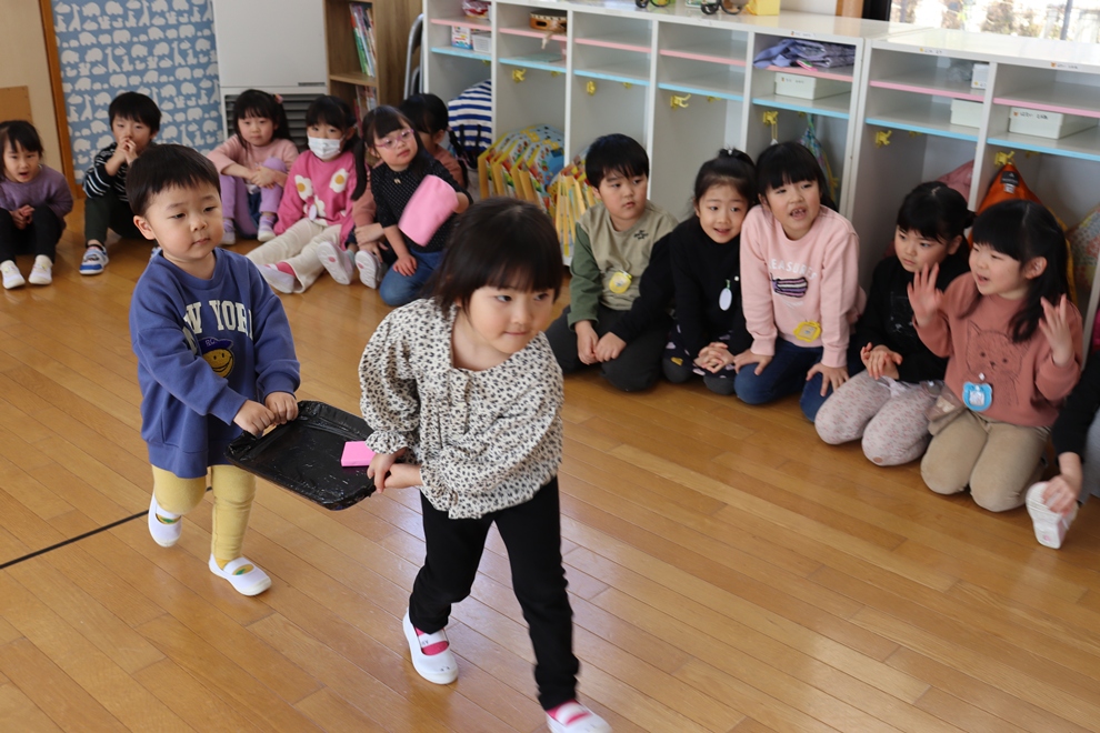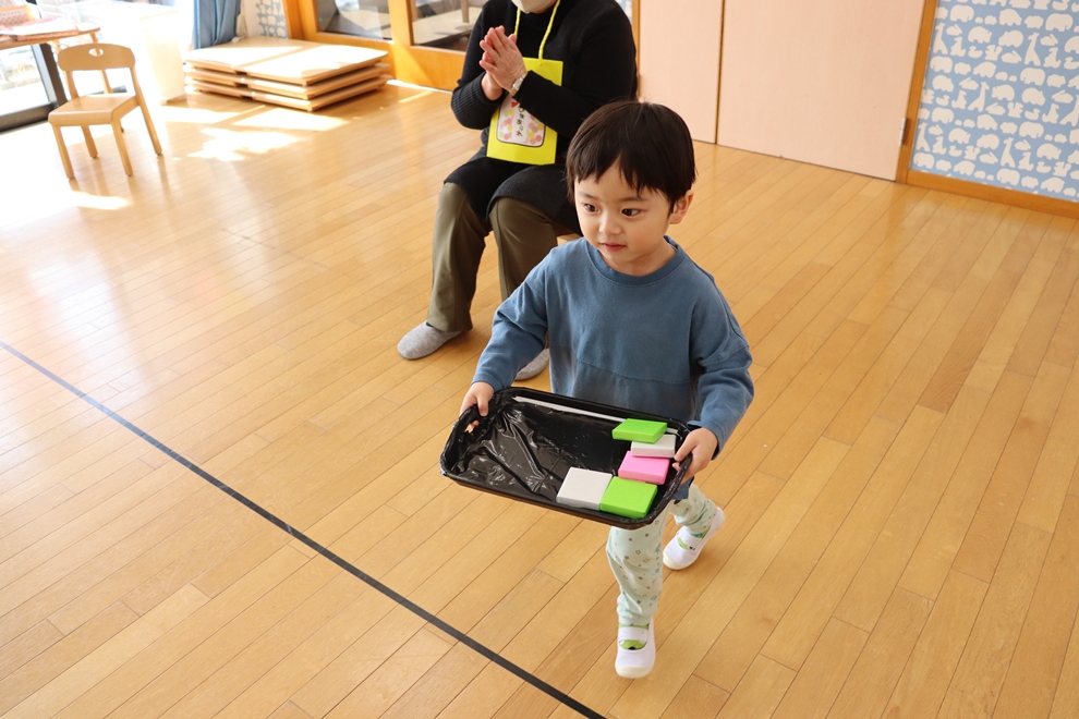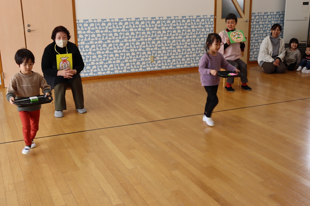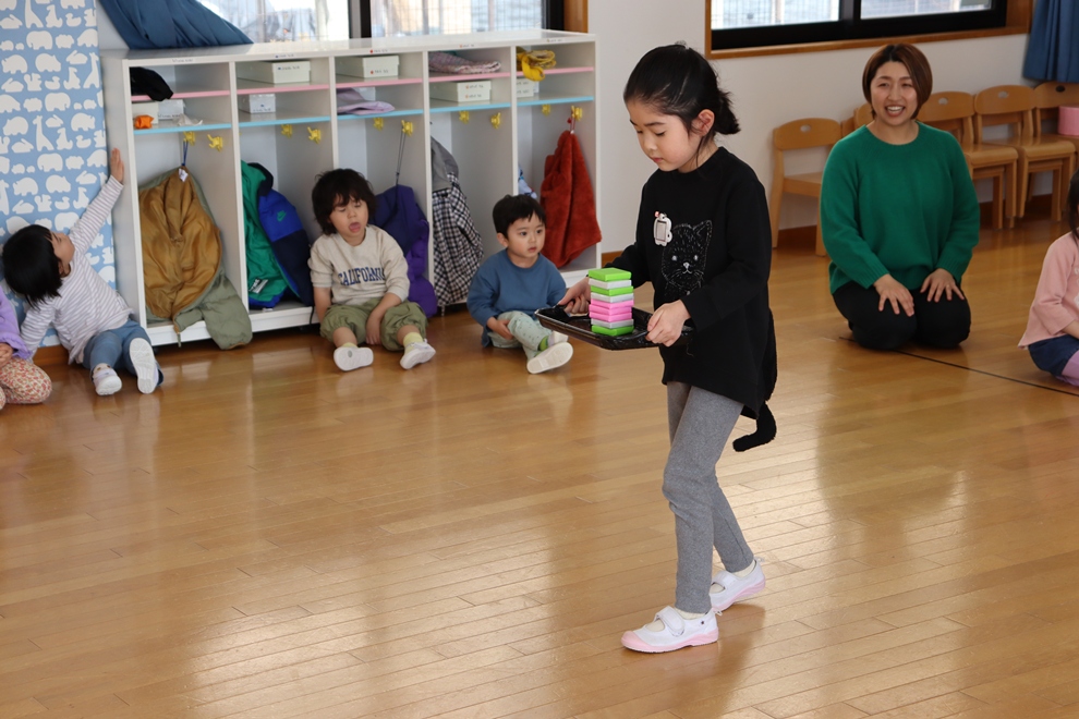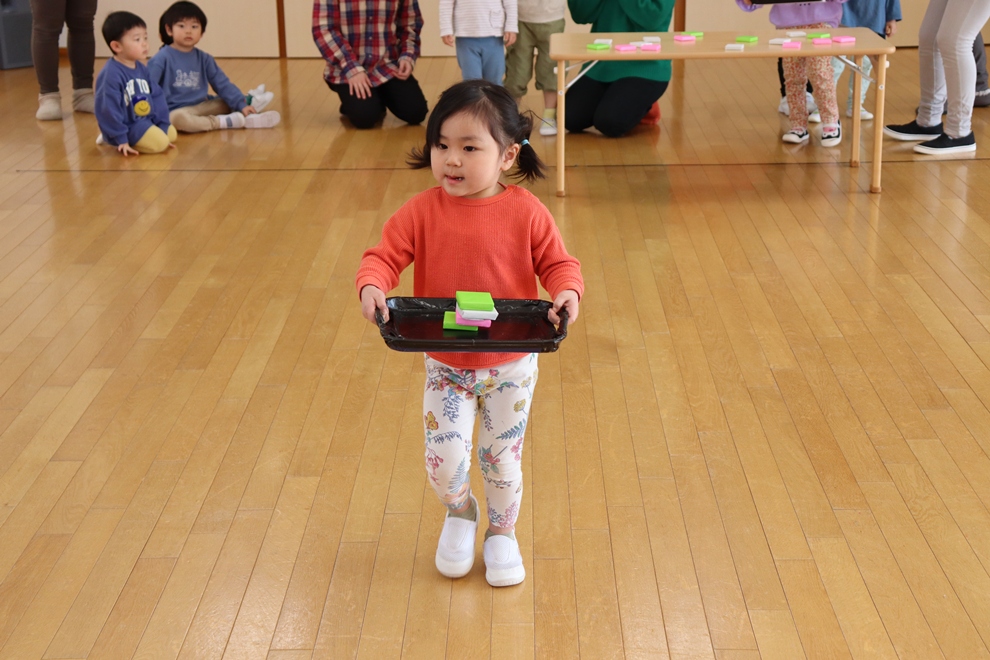 おぼんにひし餅を一個ずつ乗せて、上手に運べるかな!?
