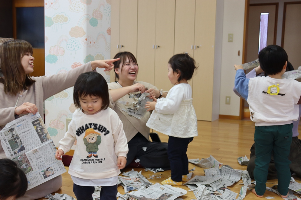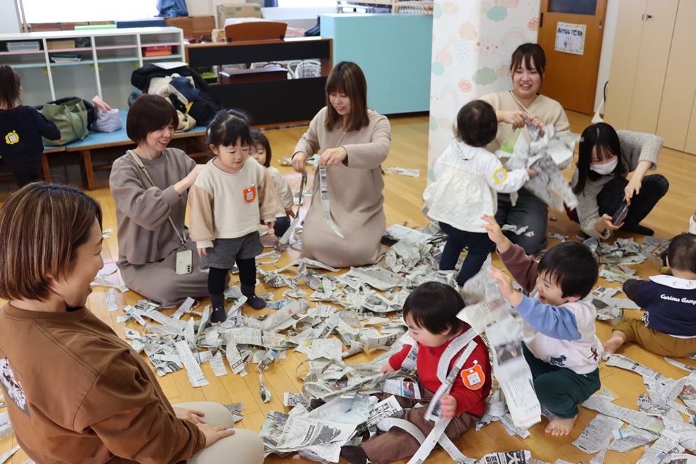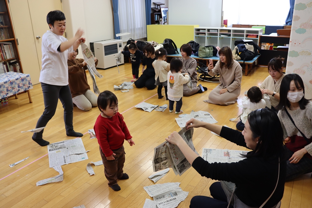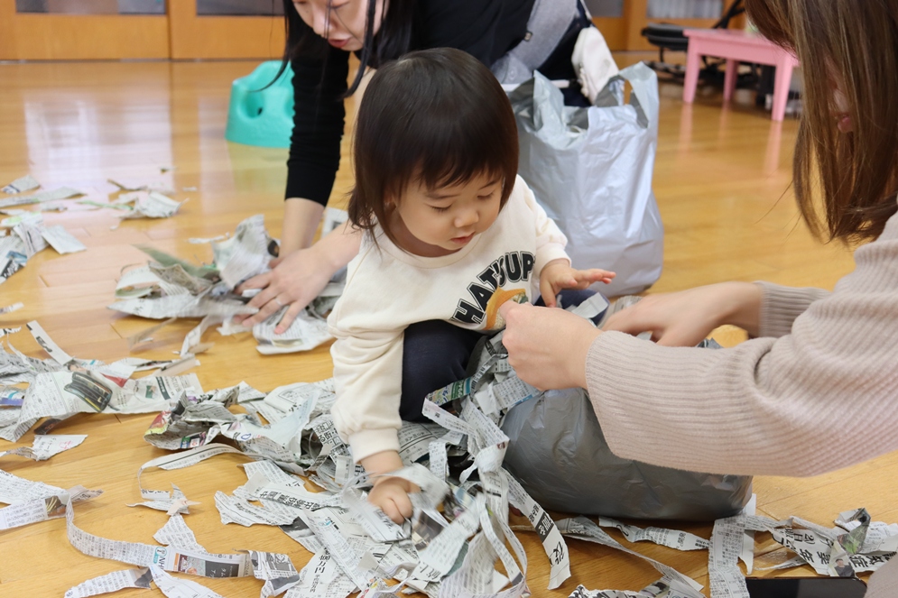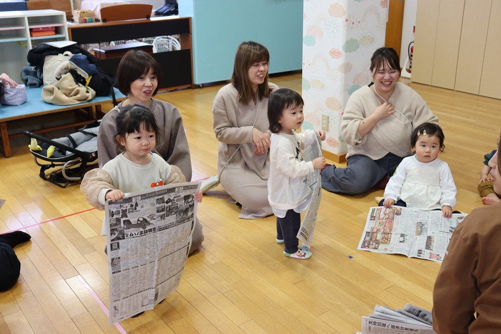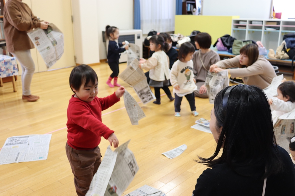 この日の子育て支援は、お家ではなかなかできない?!ダイナミックな新聞遊びをしました🎵