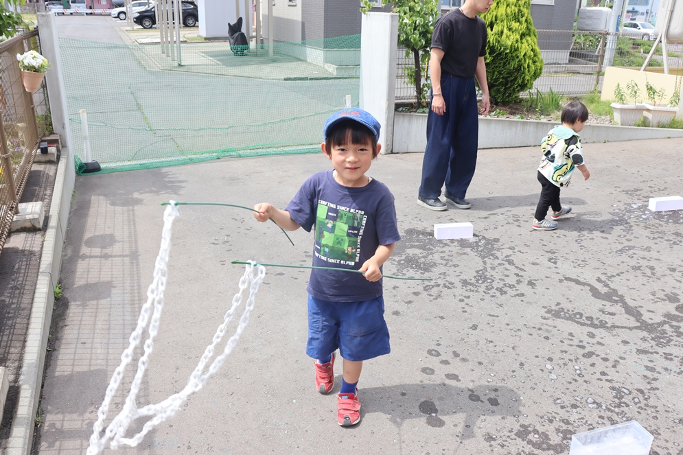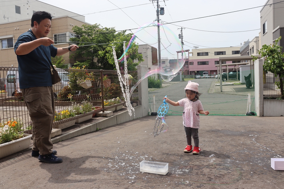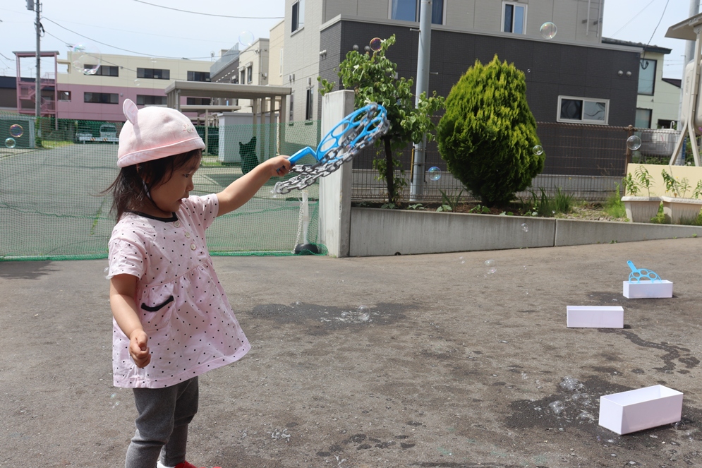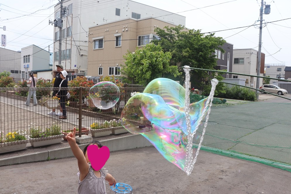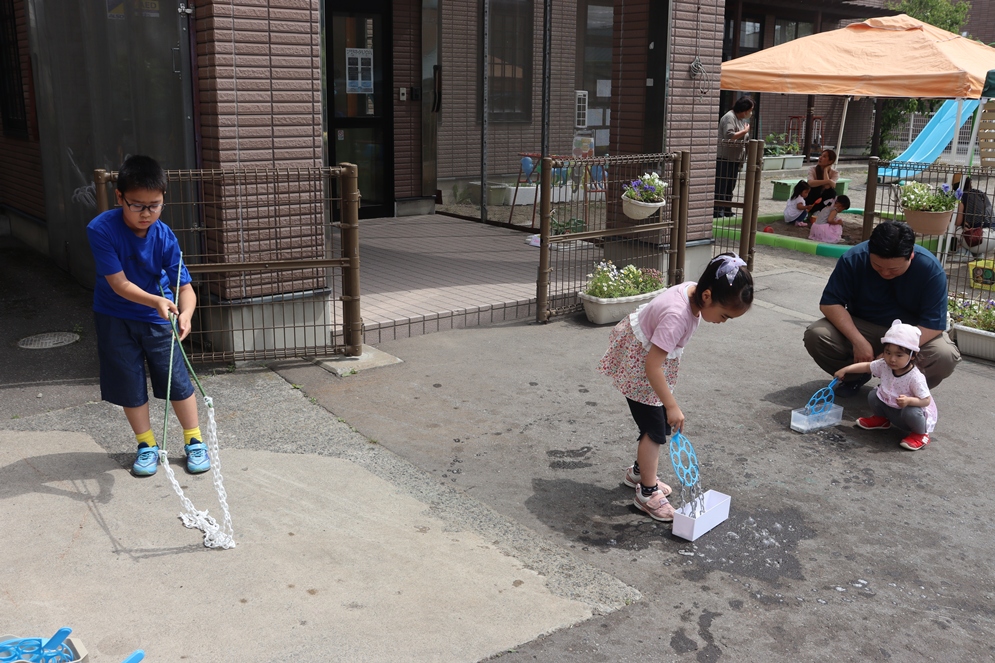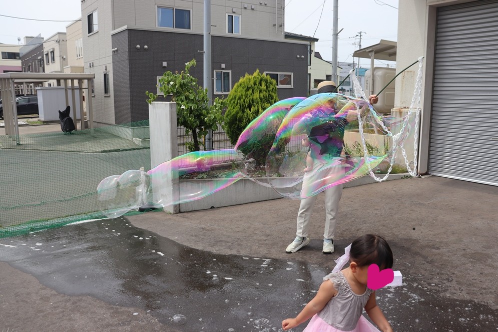前回の土曜園解放でも大人気だった大型シャボン玉遊びを、リクエストにお答えして今回も沢山あそびましたよ✨(^_-)-☆