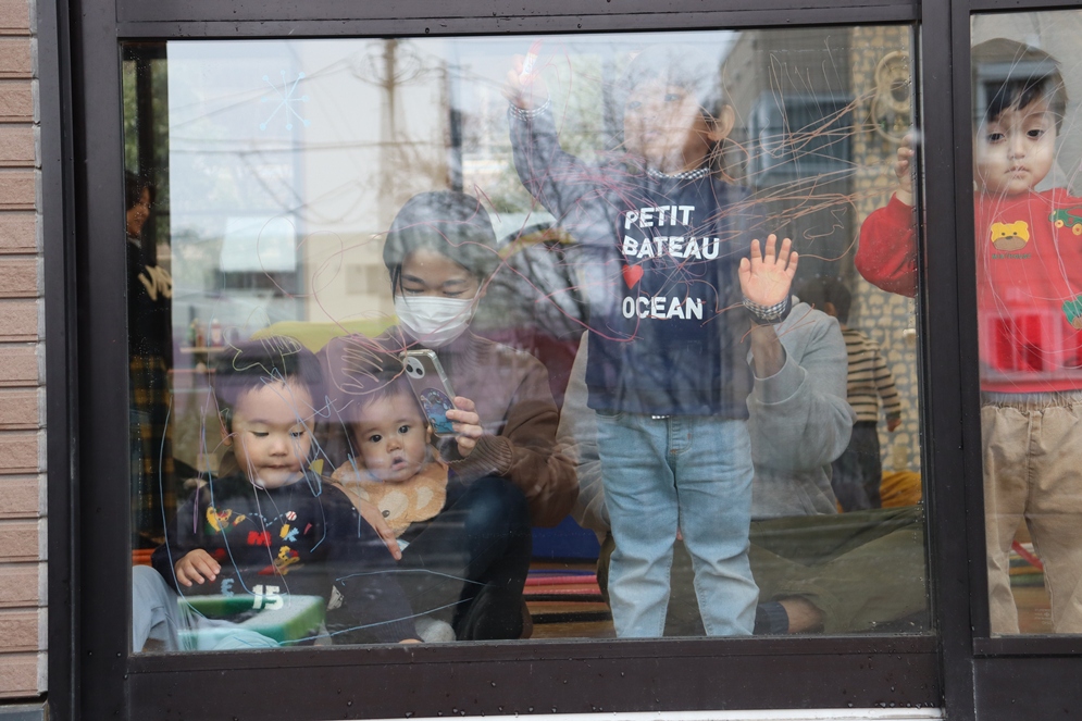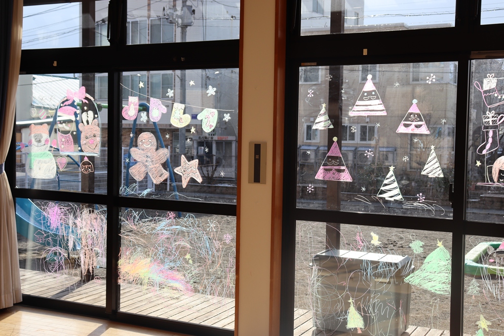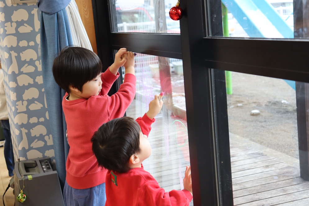 ガラスには、水で消えるクレヨンで自由にお絵描き🌀