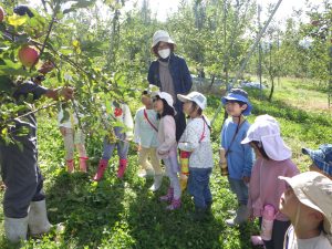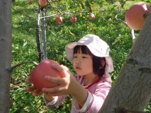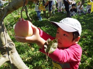 りんごのもぎ方をよく聞いて、いざ挑戦!