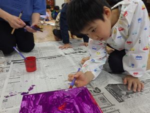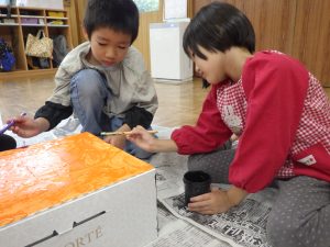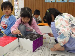 箱のまわりを絵の具でぬりぬり。