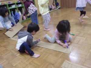ダンボールにひたすら線を描きましたよ。