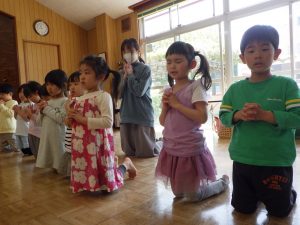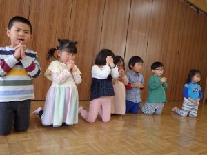 おひさま組さんは、お兄さんやお姉さんの見て真似ながら、礼拝をしていましたよ✨