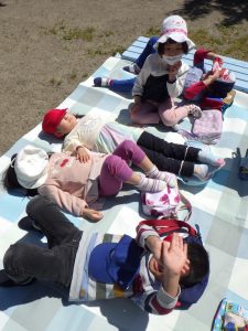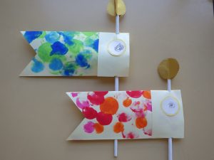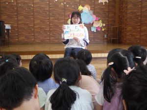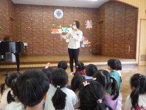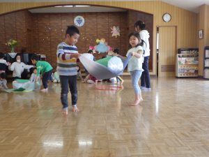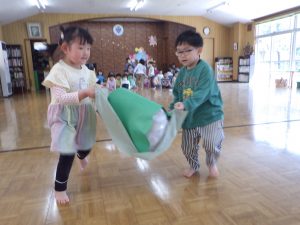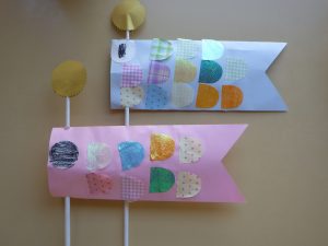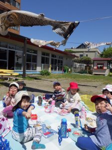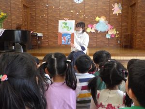 「5月5日は・・・子どもの日。」「こいのぼりのお魚は、なぜ鯉かと言うと・・・。」など、こいのぼりの由来などのお話を聞きました。『次は何が出てくるんだろう?』とワクワクしながら見ていましたよ♪