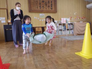 かしわ餅運び♪お友だちと一緒にかしわ餅を落とさないように慎重に2人力を合わせ運びましたよ😊