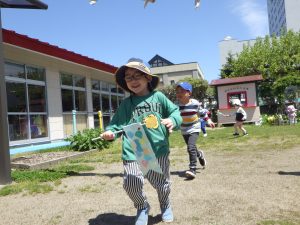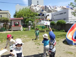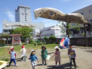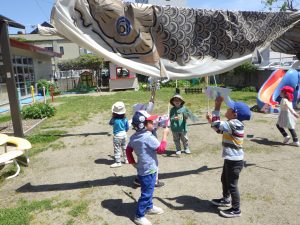 ちゅうりっぷ組さんは、園庭を作ったこいのぼりを持って泳がせましたよ🎏