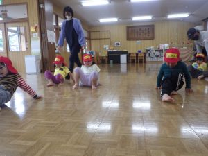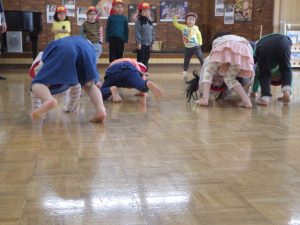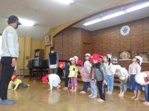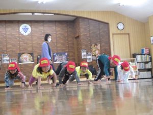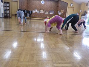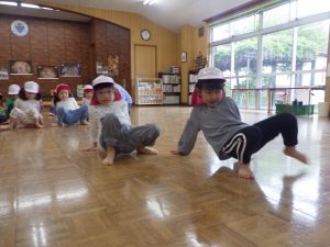 段々難しい動き!手を後ろについて、お尻を床につけないように・・・
