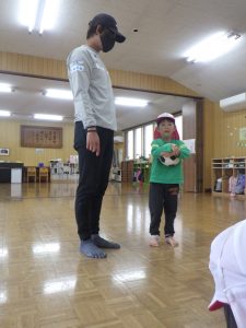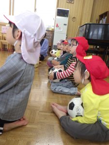 コーチのお話を聞いている時や待っている時など、ボールが逃げないようにしっかりと持っていることなど、真剣に聞いていたちゅうりっぷ組さん。