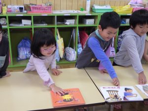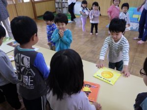 おひさまさんは、今日初めて幼稚園の絵本を借りて帰ります。「お家で読むの楽しみ!」とニコニコで選んでいたので、ぜひ、お家で一緒に楽しんでみて下さいね。