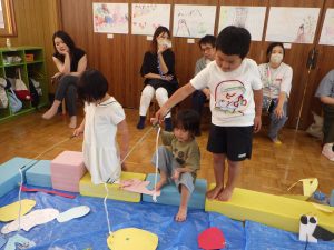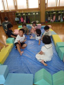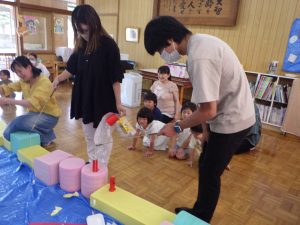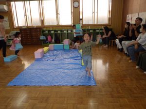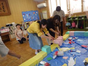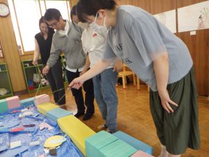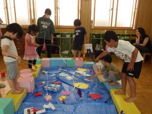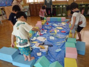 ブルーシートを敷いて、積み木を運んで…力を合わせて海作り!