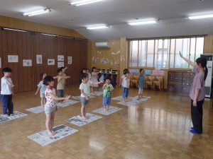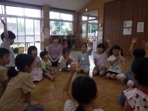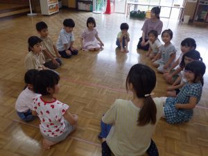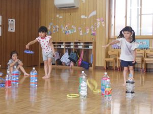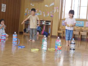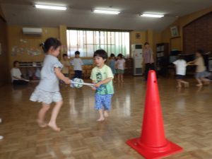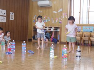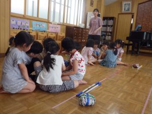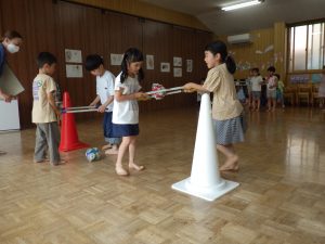 次は、新聞の棒で新聞のボールをお友達と運びますよ。