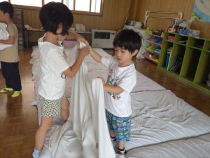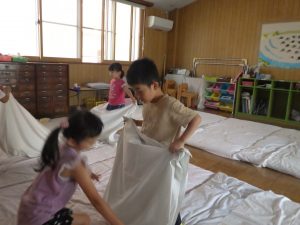 大きなシーツはお友達と協力して