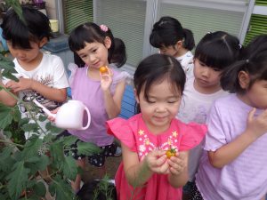 朝のお庭でプチトマトを収穫