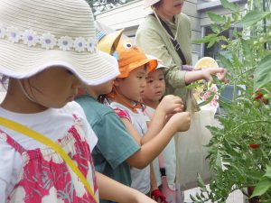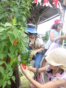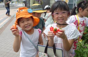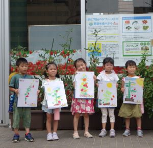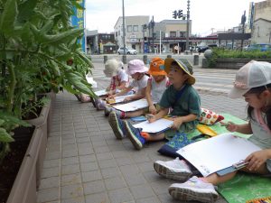 街中で育った野菜を見ることができたこと、育った野菜を見て絵を描いたこと、収穫したこと。