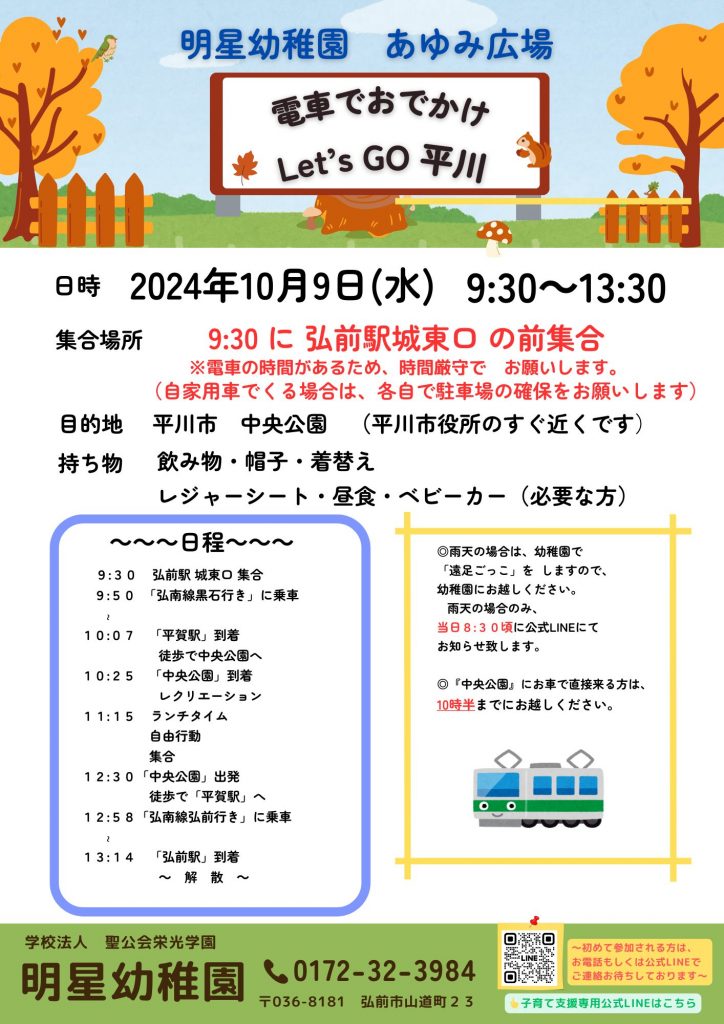 \\子育て支援からのお知らせ// 2024/09/30 10月9日(水)のあゆみ広場のお知らせです♪ 申し込みの締め切りは、10月7日(月)となっています! 参加希望の方は、電話もしくは子育て支援公式LINEでお申込みくださいね♪♪ 子育て支援担当 葛西・吹田 🌾稲刈り🌾 避難場所まで歩いたよ