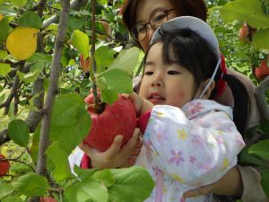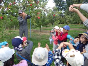 「りんごを引っ張ったり、回したりしないで、二つの手でしっかり持って上に向けると取れます」と取り方も教えてもらい、いざりんごの収穫へ‼
