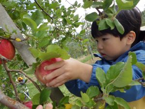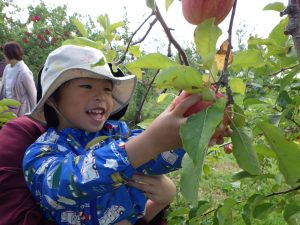 自分でどのりんごを取るのか決め、届かない所は先生に抱っこしてもらいながら、『弘前ふじ』と『シナノスイート』の2種類を収穫しました🍎
