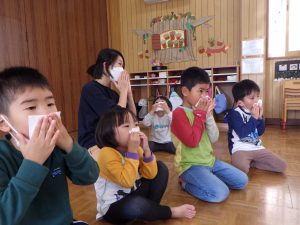 鼻水を上手にかめるかな~?まずは鼻息でティッシュをひらひら~